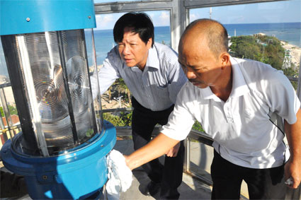 | Ông Phạm Đình Vận (trái), Tổng Giám đốc Tổng Công ty bảo đảm an toàn hàng hải miền Nam và trạm trưởng hải đăng Sơn Ca, ông Phạm Xuân Thạch kiểm tra ánh sáng của cây đèn biển. |
