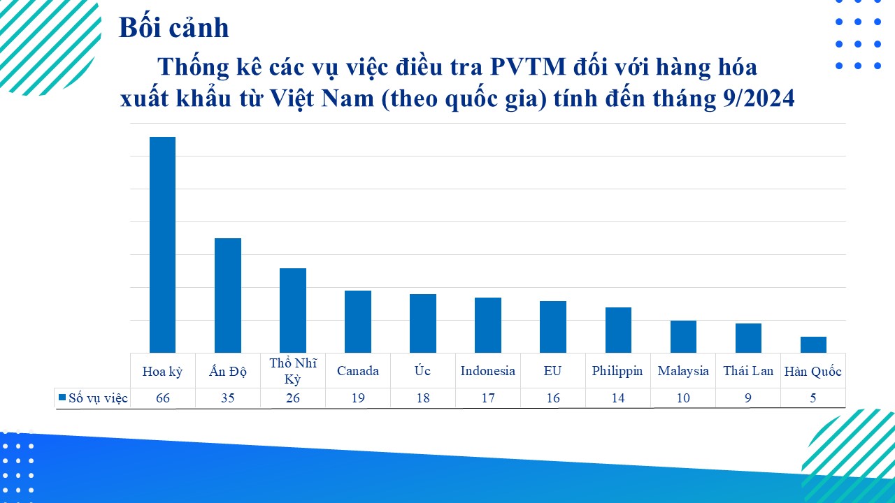 Theo thống kê của Bộ Công Thương, tính đến tháng 9/2024, Việt Nam đã đối mặt với 263 vụ điều tra phòng vệ thương mại từ 24 quốc gia khác nhau, trong đó hơn 70% là các vụ điều tra chống bán phá giá và chống trợ cấp. Thực trạng này đòi hỏi các DN Việt phải chủ động xây dựng chiến lược ứng phó hiệu quả để bảo vệ mình trước những nguy cơ pháp lý, đồng thời phát huy tối đa tiềm năng thị trường quốc tế.