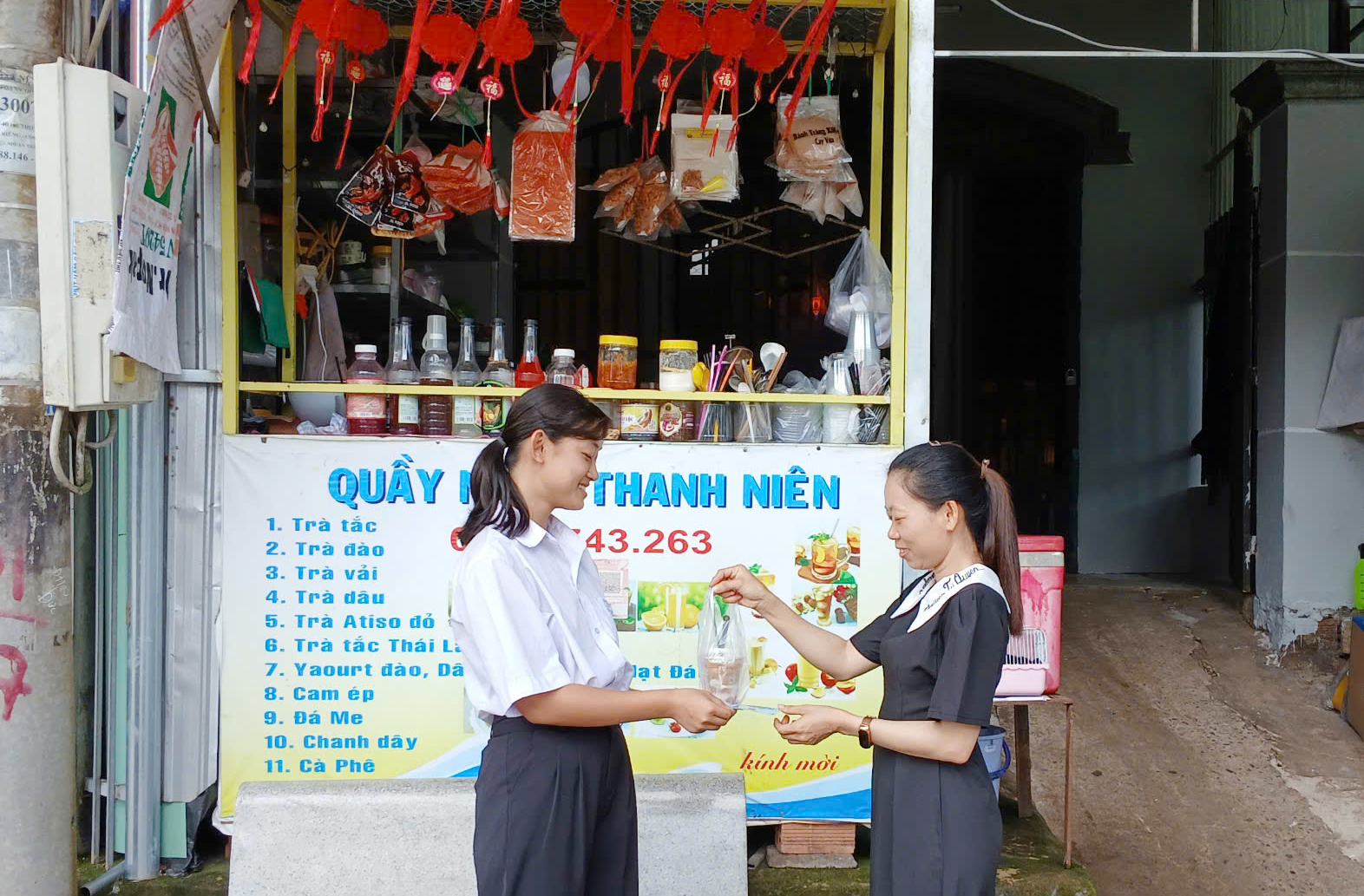 | Chị Nguyễn Thị Yến (phải) và quầy nước nhỏ phục vụ khách. |