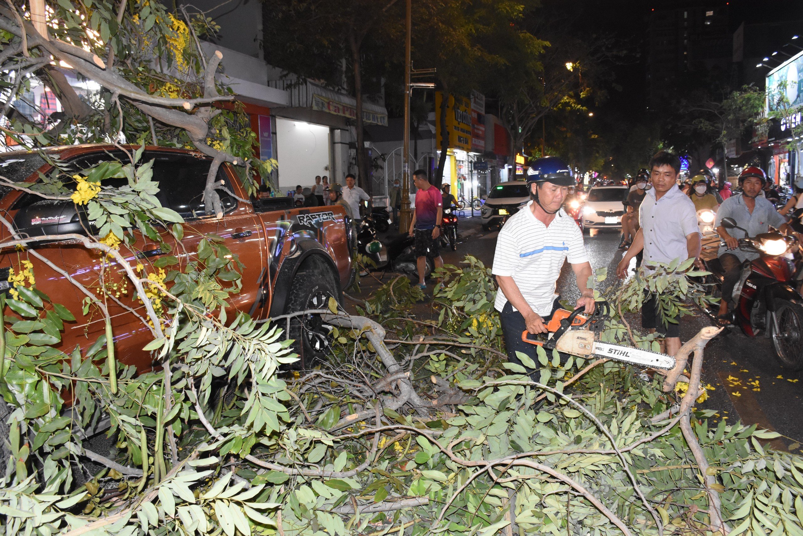 Công ty CP Phát triển công viên cây xanh và đô thị Vũng Tàu đã điều động công nhân đưa thiết bị, dụng cụ đến cắt phần thân cây đè lên xe. Sau gần 1 tiếng đồng hồ, toàn bộ phần thân cây bị ngã đổ đã được xử lý, giải phóng cho xe bán tải có thể di chuyển.