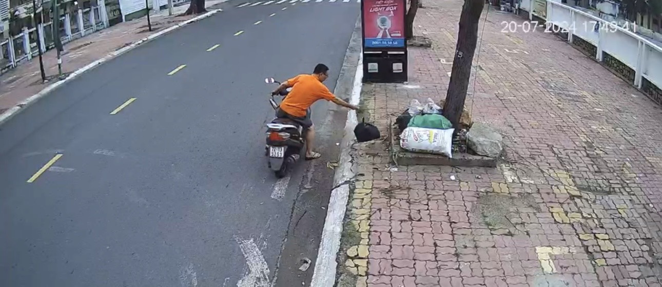 Trước đó, một người đàn ông khác mặc áo màu cam, không đội nón bảo hiểm chạy xe hai bánh mang rác đến khu vực này bỏ trộm rồi phóng xe đi nhanh.