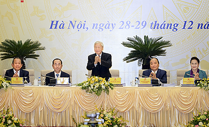 Sáng 28-12-2017, Hội nghị triển khai kế hoạch phát triển kinh tế-xã hội và dự toán ngân sách Nhà nước năm 2018 được tổ chức trực tuyến với các địa phương. Tổng Bí thư Nguyễn Phú Trọng, Chủ tịch nước Trần Đại Quang, Thủ tướng Chính phủ Nguyễn Xuân Phúc, Chủ tịch Quốc hội Nguyễn Thị Kim Ngân dự hội nghị, tại Hà Nội. Ảnh: TRÍ DŨNG