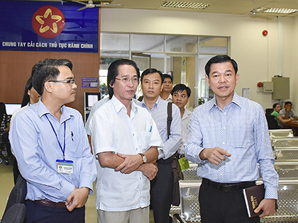 | Đồng chí Nguyễn Hồng Lĩnh, Ủy viên Trung ương Đảng, Bí thư Tỉnh ủy, Chủ tịch HĐND tỉnh thăm và làm việc tại Bộ phận tiếp nhận và trả kết quả tập trung cấp tỉnh. Ảnh: PHÚC LƯU |