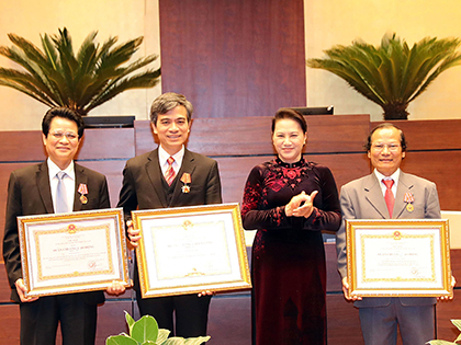 | Chủ tịch Quốc hội Nguyễn Thị Kim Ngân trao Huân chương Chiến công hạng Ba và Huân chương Lao động hạng Nhì cho các cá nhân. Ảnh: TRỌNG ĐỨC |
