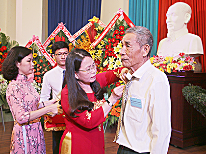 | Đồng chí Nguyễn Thị Yến, Phó Bí thư Thường trực Tỉnh ủy, Trưởng Đoàn ĐBQH tỉnh gắn huy hiệu 60 năm tuổi Đảng cho đồng chí Phan Văn Điến (xã Long Phước, TP. Bà Rịa). |