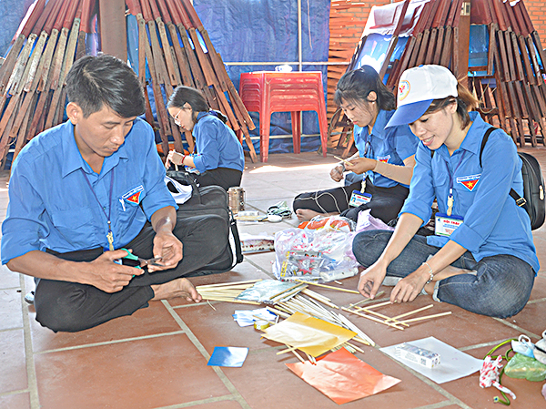 Cán bộ Đoàn thi thiết kế cổng trại trong Hội trại “Thủ lĩnh thanh niên” huyện Xuyên Mộc năm 2018.