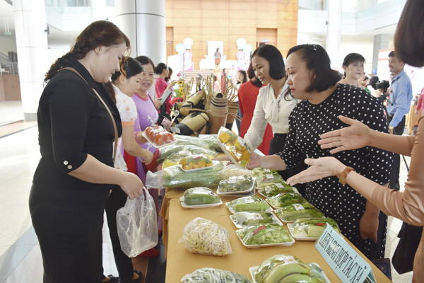| Các đại biểu tham quan và mua sắm tại gian hàng rau an toàn của các phụ nữ Liên minh Hợp tác xã Tiện Lợi (huyện Xuyên Mộc). |