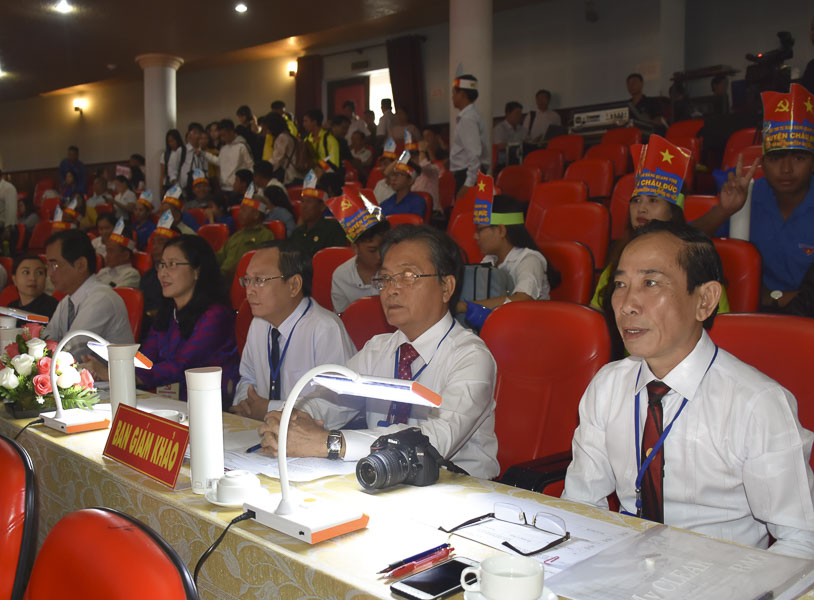 | Ông Đặng Mạnh Trung (hàng đầu, bên phải), Vụ trưởng, Trưởng Cơ quan thường trực Ban Tuyên giáo Trung ương khu vực phía Nam; bà Nguyễn Thị Yến, Phó Bí thư Thường trực Tỉnh ủy, Trưởng Đoàn ĐBQH tỉnh; ông Bùi Chí Thành (bên trái), Ủy viên Dự khuyết Trung ương Đảng, Ủy viên Ban Thường vụ Tỉnh ủy, Chủ tịch Ủy ban MTTQVN tỉnh; ông Nguyễn Văn Xinh (thứ hai, từ trái qua), Ủy viên Ban Thường vụ Tỉnh ủy, Trưởng Ban Tuyên giáo Tỉnh ủy tham dự lễ khai mạc hội thi. |