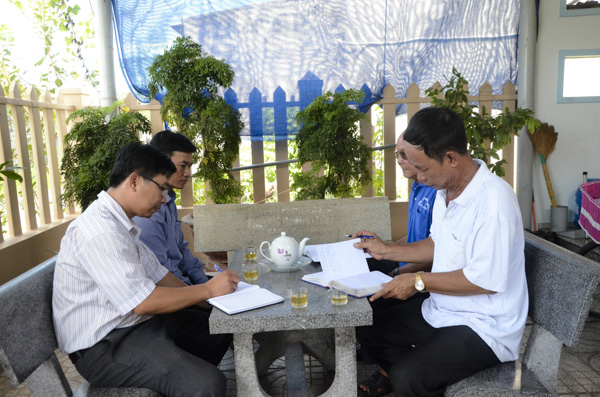 | Ông Đỗ Văn Kiếm (bìa phải), Bí thư Chi bộ, Tổ trưởng Tổ Dân vận ấp An Hải trao đổi công việc với cán bộ dân vận huyện. |