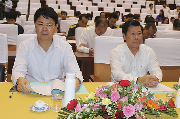 | Ông Nguyễn Văn Xinh, Ủy viên Ban Thường vụ Tỉnh ủy, Trưởng Ban Tuyên giáo Tỉnh ủy (bìa phải) và ông Nguyễn Thanh Tịnh, Phó Chủ tịch UBND tỉnh tham dự hội nghị. |