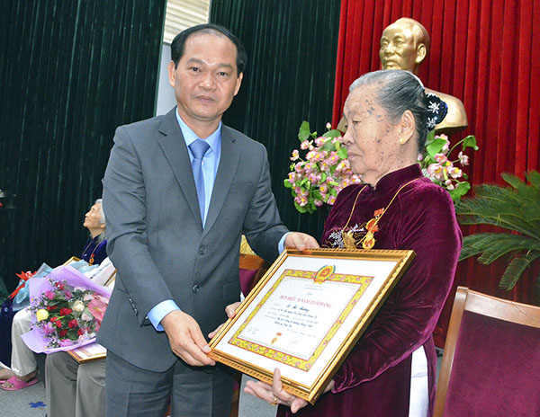 | Ông Mai Ngọc Thuận, Ủy viên Ban Thường vụ Tỉnh ủy, Phó Chủ tịch HĐND tỉnh đến dự và trao Huy hiệu 70 năm tuổi Đảng cho bà Lê Thị Thương, đảng viên Chi bộ 12, Đảng bộ phường Thắng Nhất. |