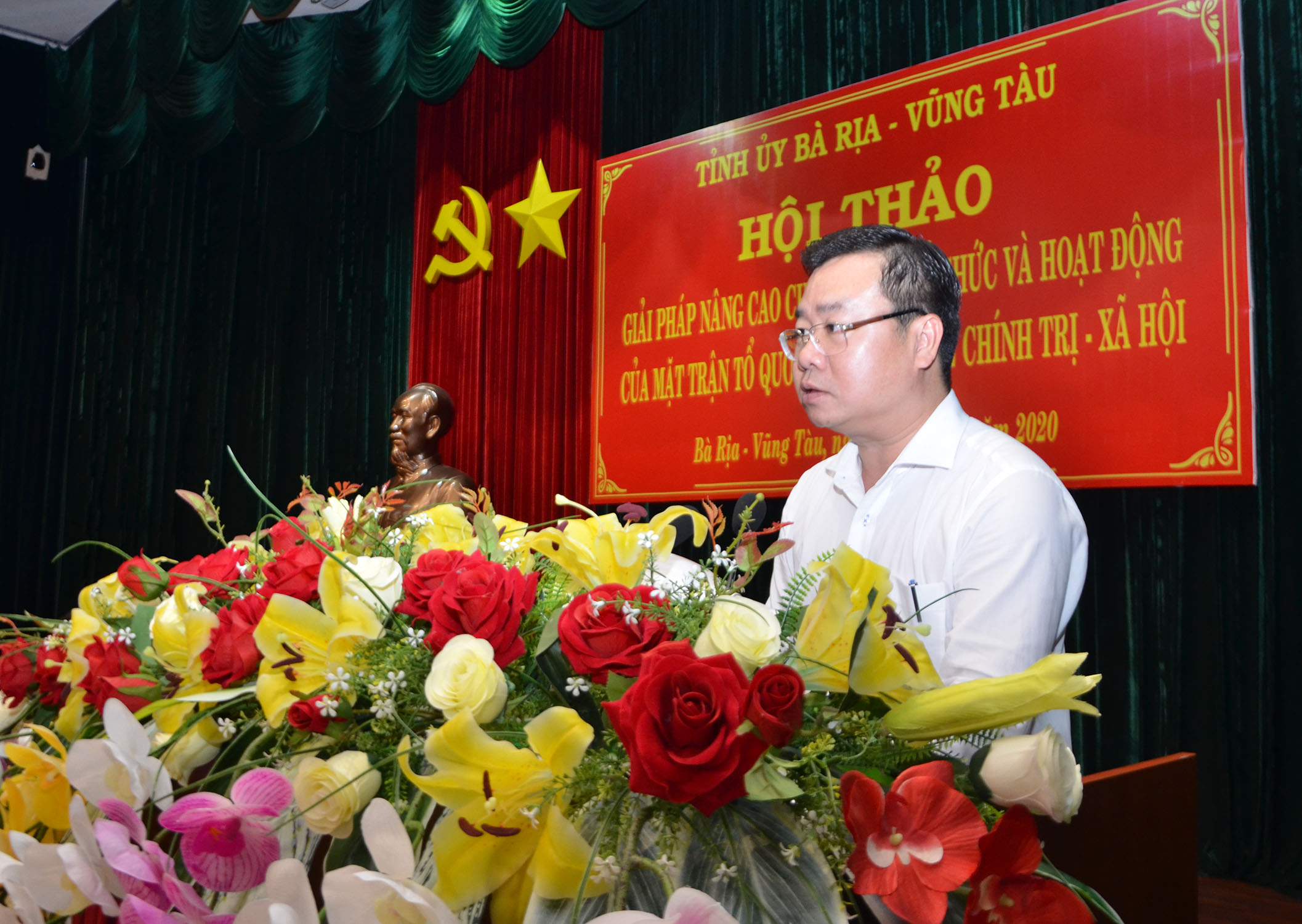 Phát biểu đề dẫn Hội thảo, ông Nguyễn Văn Đồng cho biết, thời gian qua, các cấp ủy Đảng đã lãnh đạo, chỉ đạo việc củng cố kiện toàn bộ máy tổ chức, nâng cao chất lượng tổ chức và hoạt động của mặt trận, các đoàn thể chính trị - xã hội; rà soát, đánh giá, củng cố, quy hoạch đào tạo, bồi dưỡng, sắp xếp, bố trí, sử dụng cán bộ phù hợp với điều kiện và yêu cầu nhiệm vụ; đồng thời đẩy mạnh công tác lãnh đạo, chỉ đạo việc đổi mới nội dung và phương thức hoạt động của mặt trận, các đoàn thể chính trị - xã hội. Nhờ đó, mặt trận, các đoàn thể chính trị - xã hội đã tổ chức các phong trào, hoạt động đạt hiệu quả.