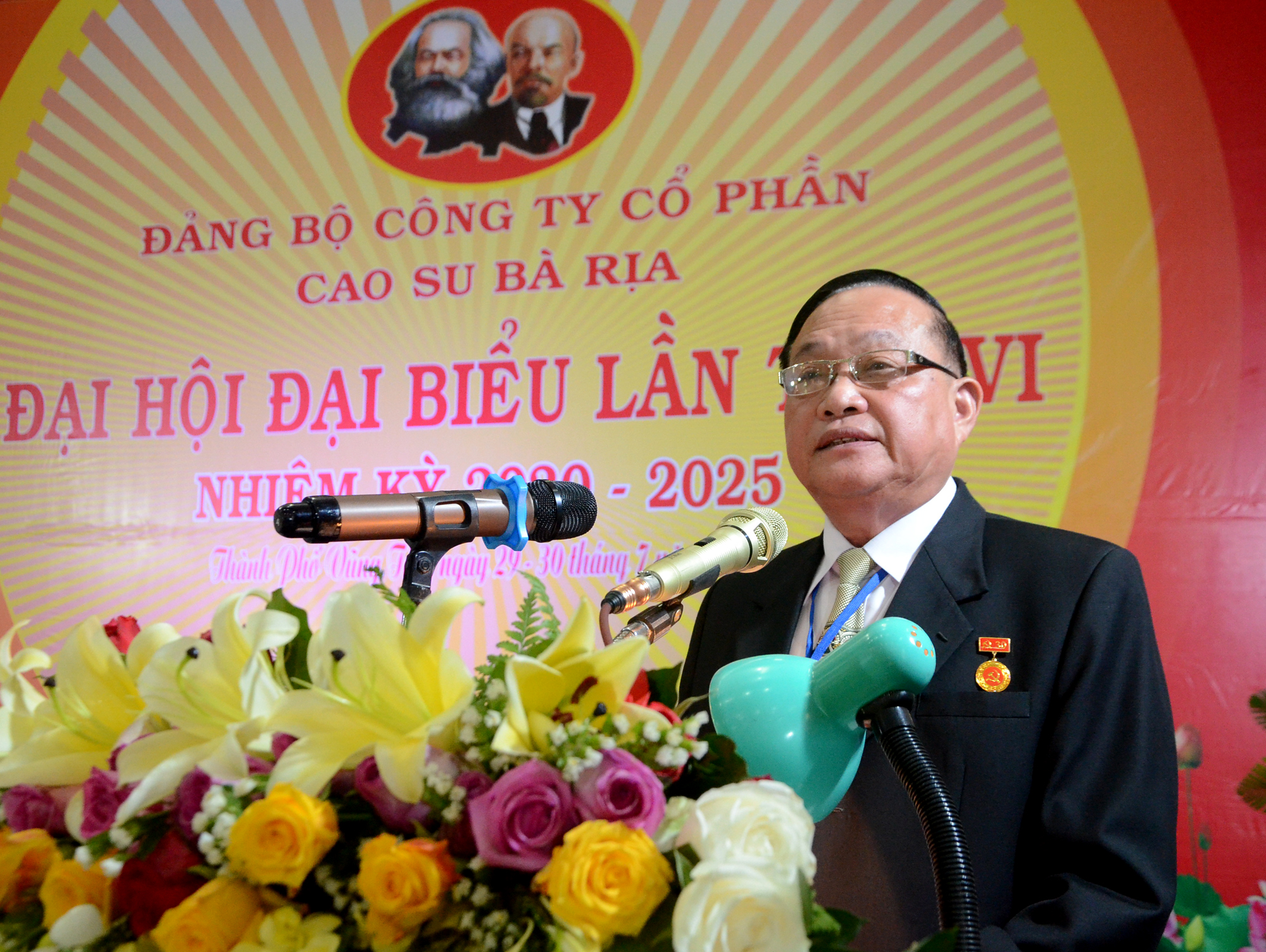 | Đồng chí Lương Trí Tiên, Ủy viên Ban Thường vụ Tỉnh ủy, Trưởng Ban Nội chính Tỉnh ủy tặng lẵng hoa chúc mừng Đại hội Đại biểu Đảng bộ Công ty CP Cao su Bà Rịa lần thứ VI, nhiệm kỳ 2020-2025. |