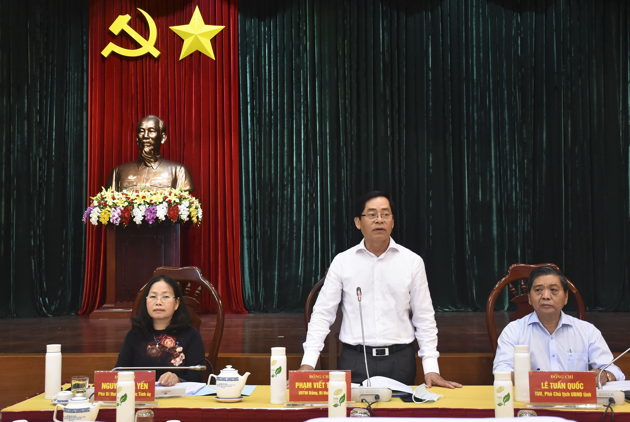 Ông Phạm Viết Thanh, Ủy viên Trung ương Đảng, Bí thư Tỉnh ủy; bà Nguyễn Thị Yến, Phó Bí thư Thường trực Tỉnh ủy, Trưởng Đoàn ĐBQH tỉnh; ông Lê Tuấn Quốc, Phó Chủ tịch UBND tỉnh chủ trì hội nghị.