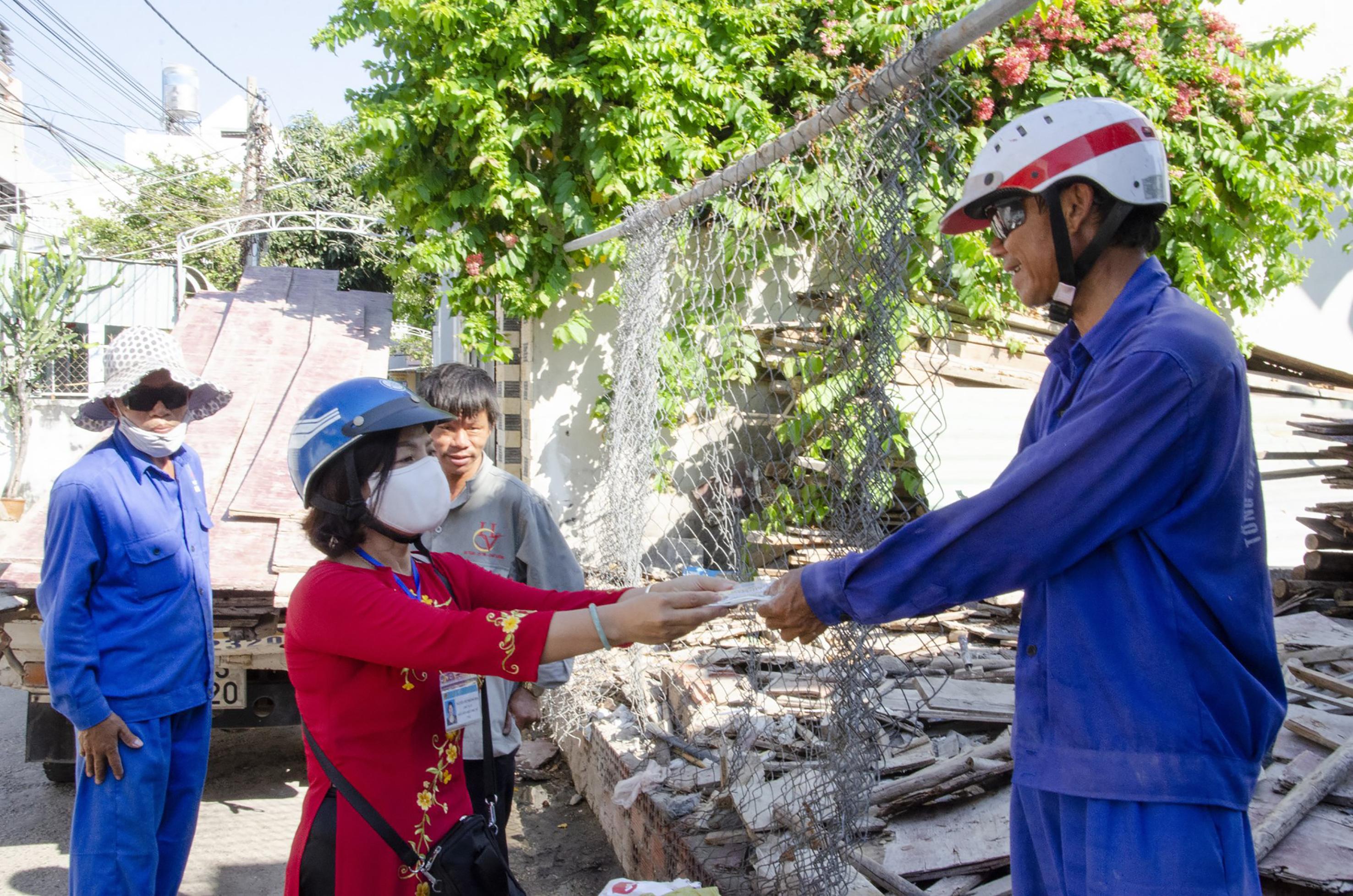 | Cán bộ, hội viên Hội LHPN phường Thắng Nhất, TP. Vũng Tàu tặng khẩu trang vải đến với người dân trên địa bàn. |