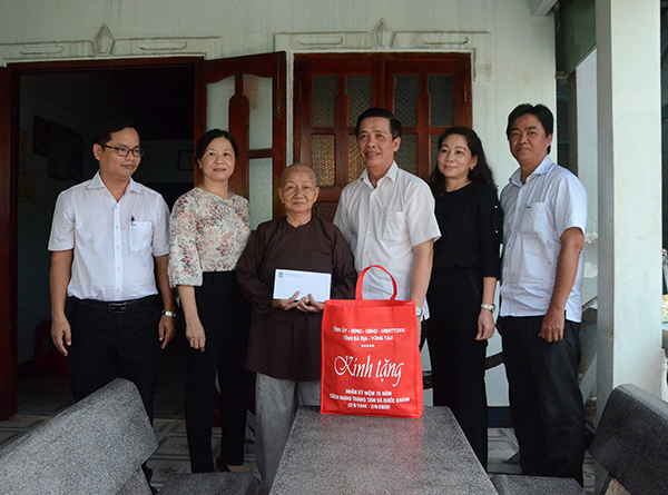 | Ông Lưu Tài Đoàn, Ủy viên Ban Thường vụ Tỉnh ủy, Trưởng ban Tổ chức Tỉnh ủy thăm, tặng quà bà Võ Thị Minh (Hinh), con liệt sĩ Võ Văn Tĩnh, khu phố Lộc An, thị trấn Phước Hải, huyện Đất Đỏ. Ảnh: VÂN ANH |
