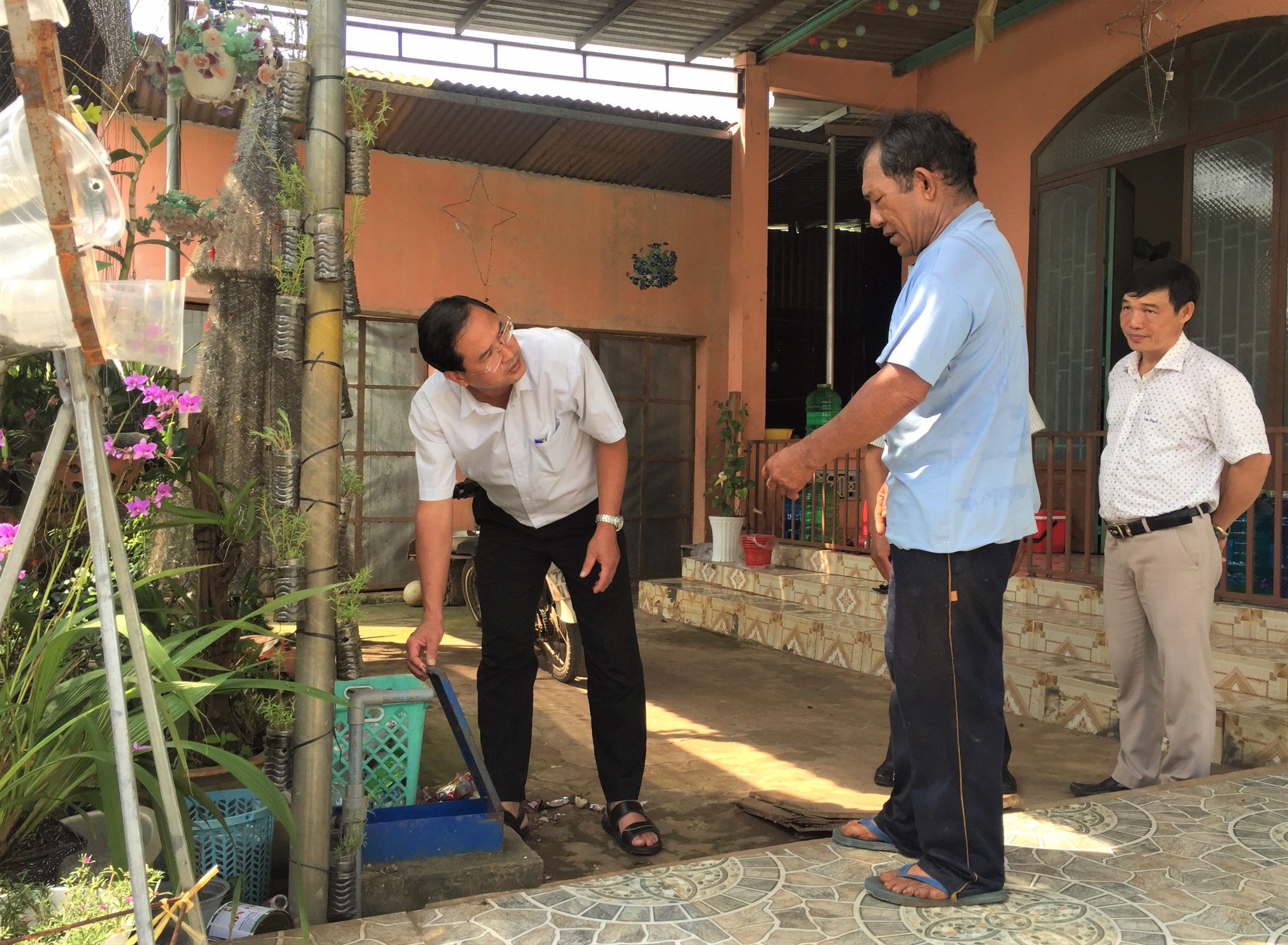 | Ông Nguyễn Tấn Bản, Phó Bí thư Thường trực Huyện ủy Châu Đức kiểm tra việc sử dụng nước sạch của người dân tộc thiểu số tại ấp Suối Lúp, xã Bình Ba. |