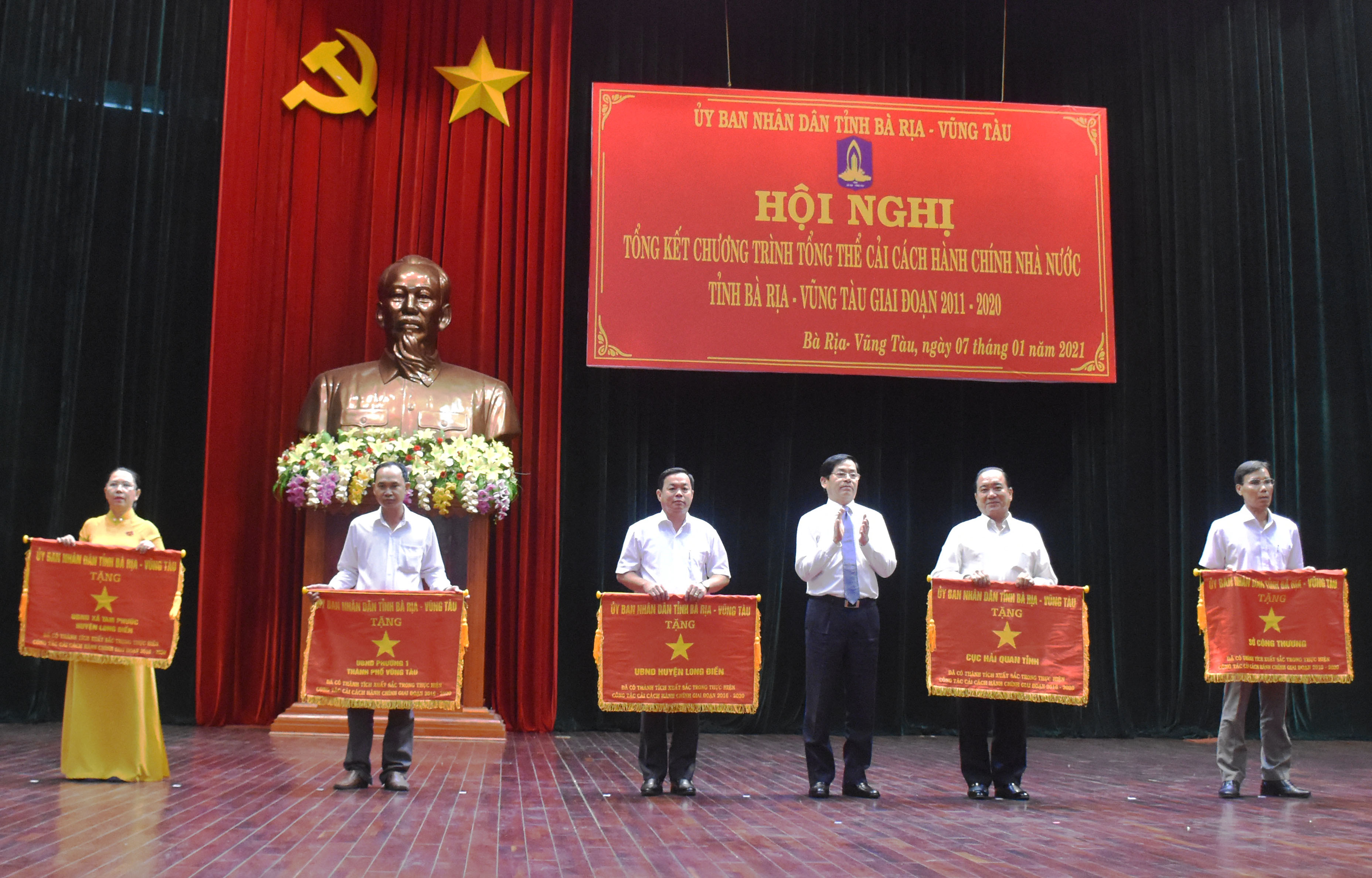 | Dịp này, Bộ Nội vụ đã tặng Bằng khen 1 tập thể là UBND huyện Châu Đức và 1 cá nhân là bà Bùi Thị Dung, nguyên Giám đốc Sở Công thương vì đã có thành tích trong thực hiện công tác CCHC nhà nước giai đoạn 2011-2020. UBND tỉnh tặng Cờ thi đua 5 tập thể; tặng Bằng khen 15 tập thể và 30 cá nhân đã có thành tích xuất sắc trong thực hiện công tác CCHC giai đoạn 2016-2020. |