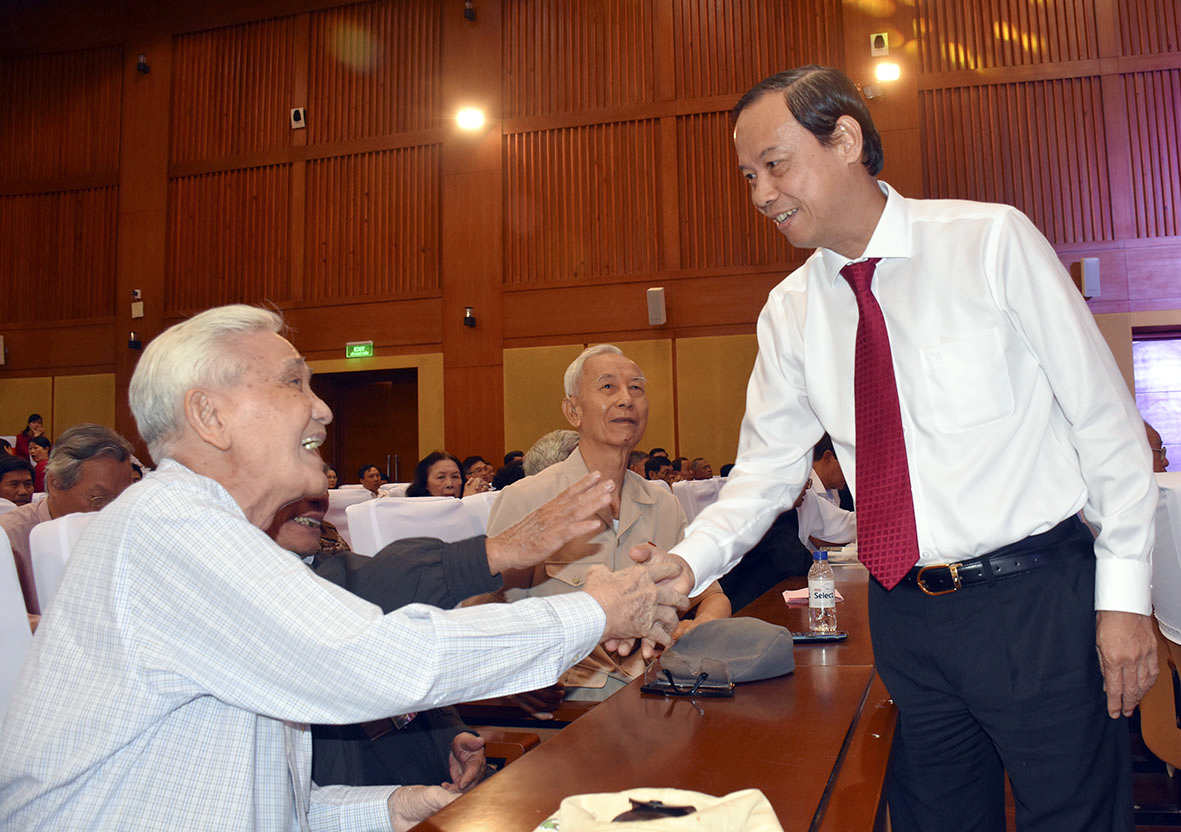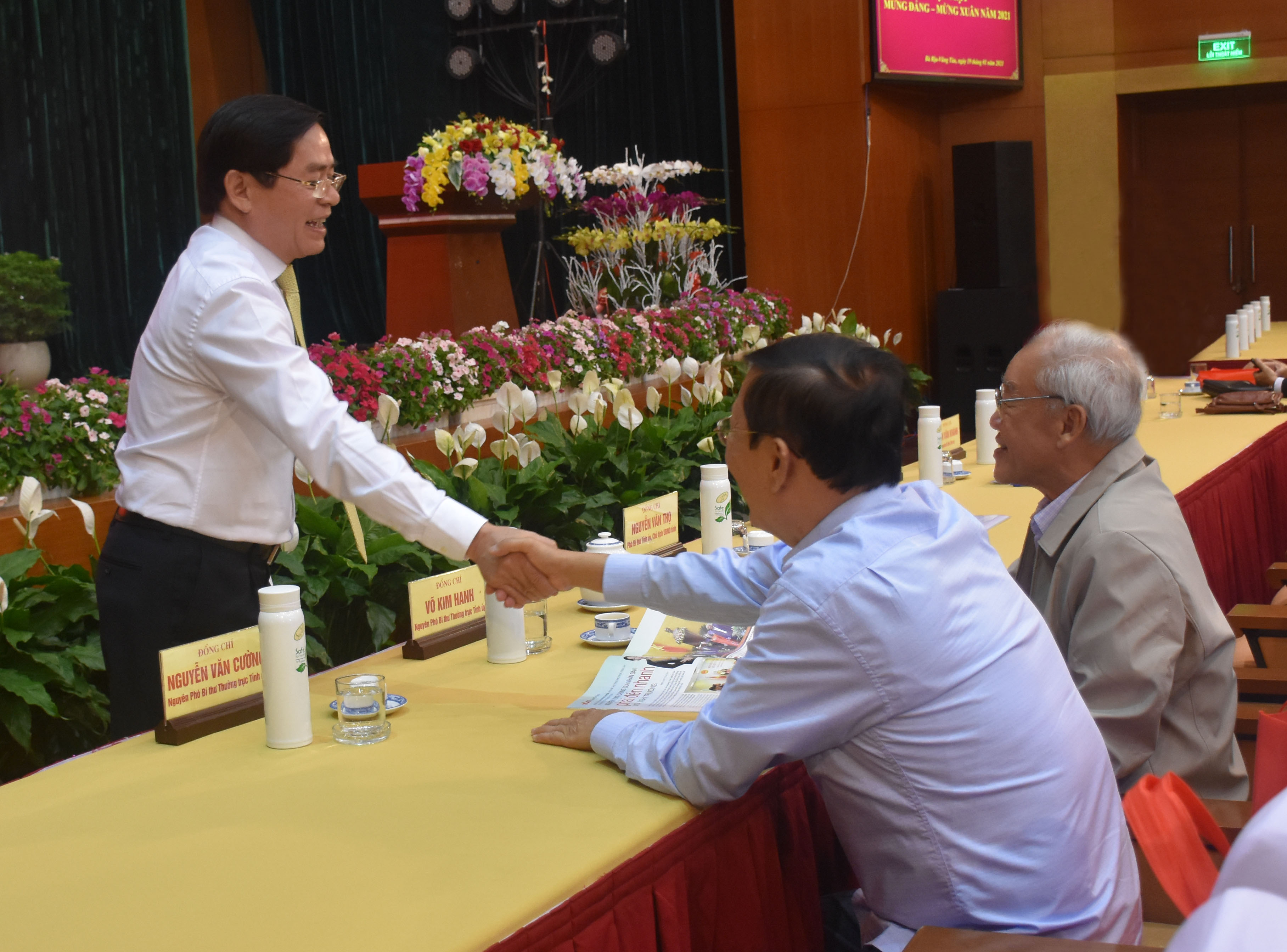 | Ông Nguyễn Văn Thọ, Phó Bí thư Tỉnh ủy, Chủ tịch UBND tỉnh thăm hỏi, chúc sức khỏe các đại biểu tại buổi họp mặt. |