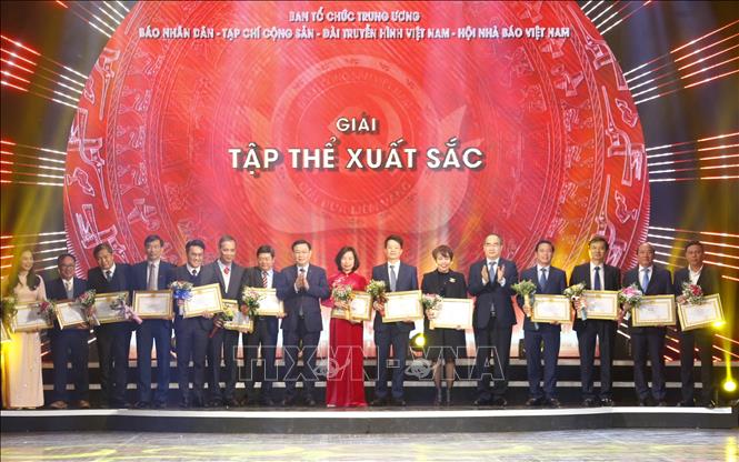 | Thủ tướng Chính phủ Nguyễn Xuân Phúc và Chủ tịch Quốc hội Nguyễn Thị Kim Ngân trao giải Đặc biệt cho Truyền hình Nhân dân với tác phẩm “Việt Nam thời đại Hồ Chí Minh - Biên niên sử truyền hình”. Ảnh: TTXVN |