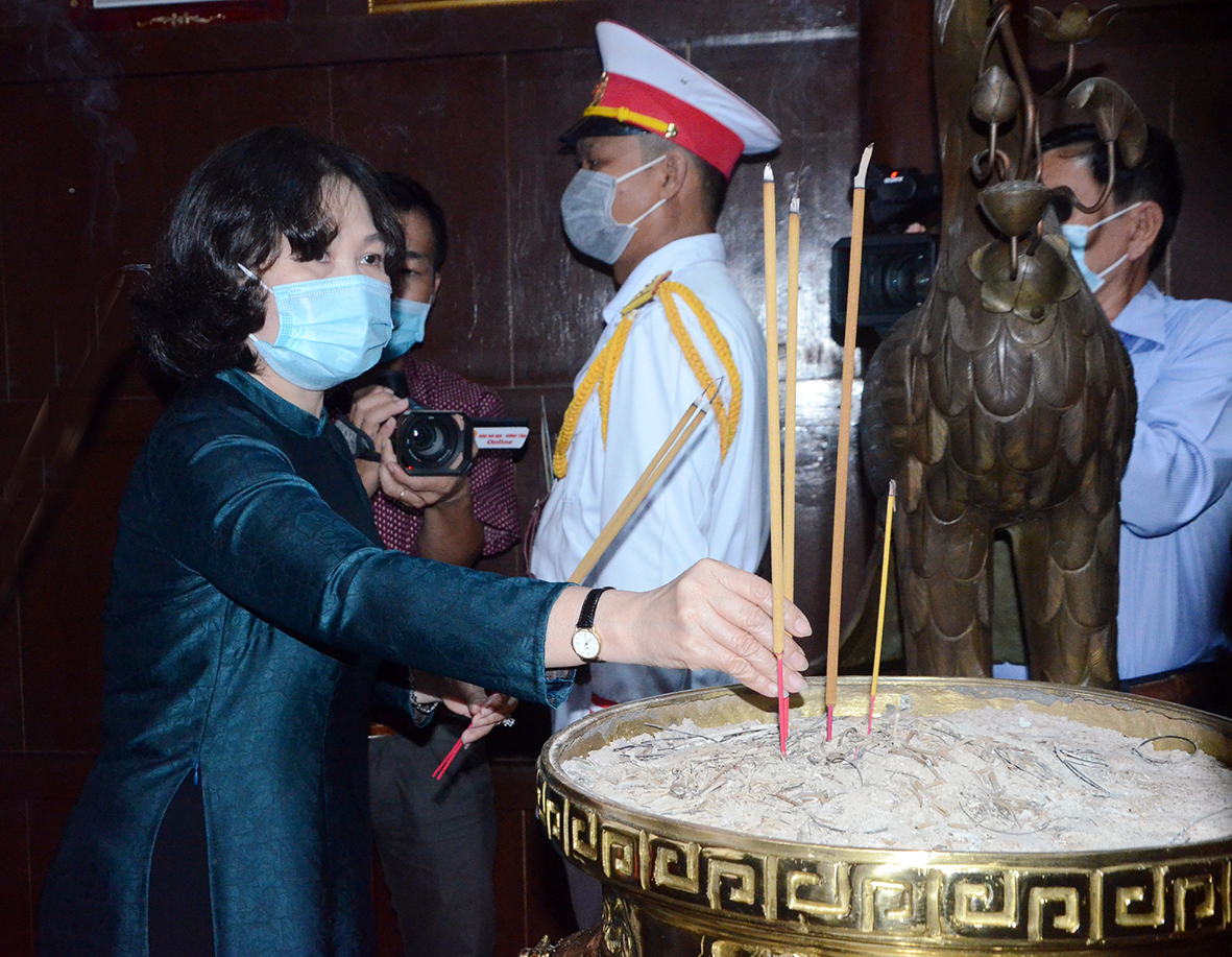 | Bà Nguyễn Thị Yến, Phó Bí thư Thường trực Tỉnh ủy, Trưởng Đoàn ĐBQH tỉnh dâng hương tưởng nhớ AHLLVTND Liệt sĩ Võ Thị Sáu. |