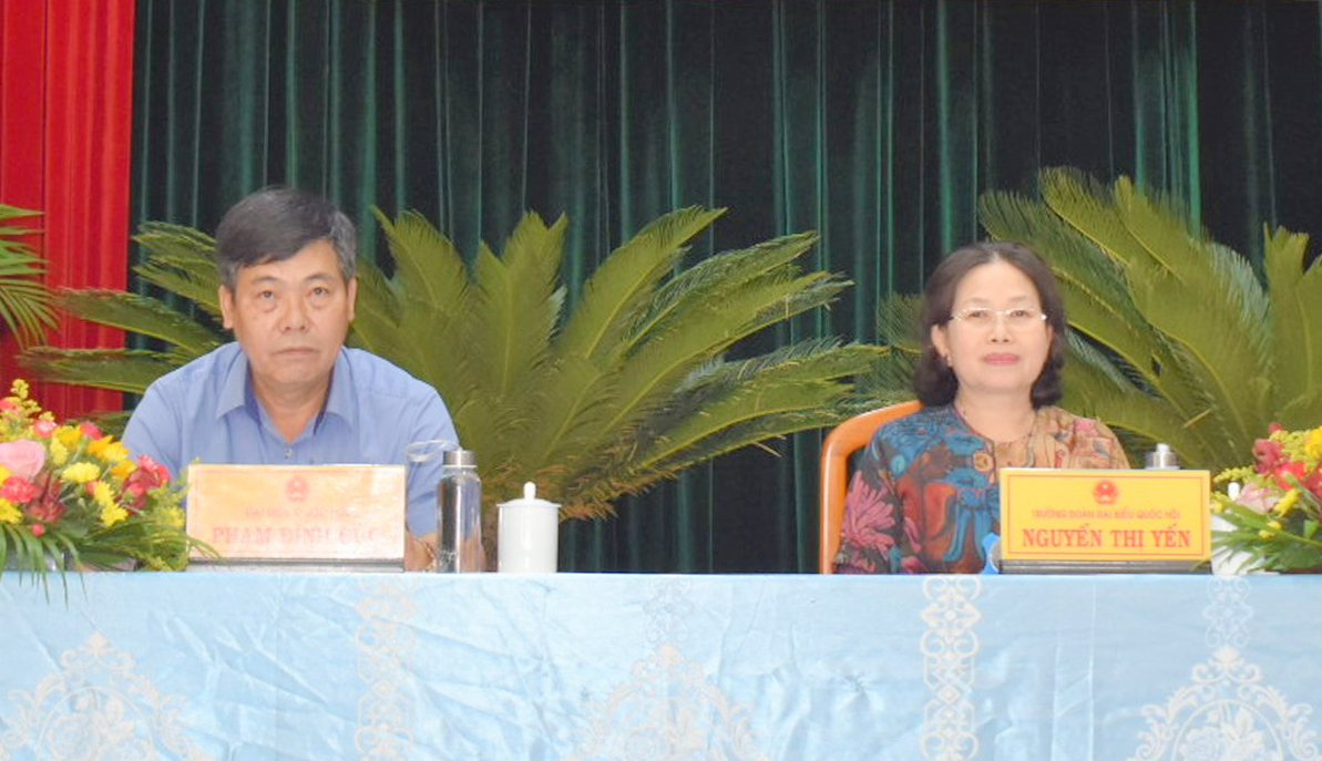 Các đại biểu Nguyễn Thị Yến, Phó Bí thư Thường trực Tỉnh ủy, Trưởng Đoàn ĐBQH tỉnh và đại biểu Phạm Đình Cúc, Phó Viện trưởng Viện KSND Cấp cao tại TP. Hồ Chí Minh tham dự buổi tiếp xúc.
