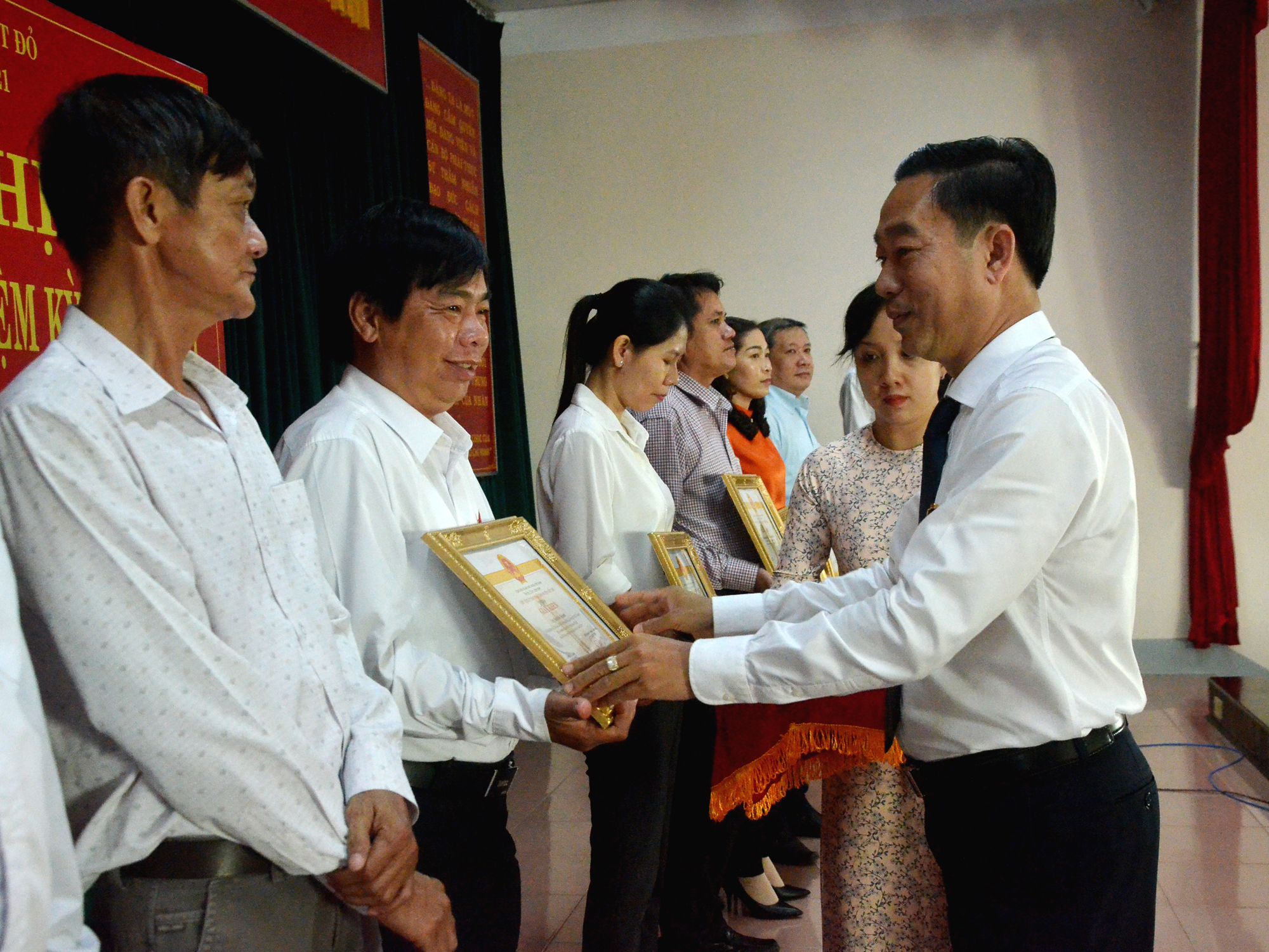 | Ông Lê Văn Hòa, Bí thư Huyện ủy Đất Đỏ trao giấy khen cho các tập thể, cá nhân có thành tích xuất sắc hoạt động HĐND nhiệm kỳ 2016-2021. |