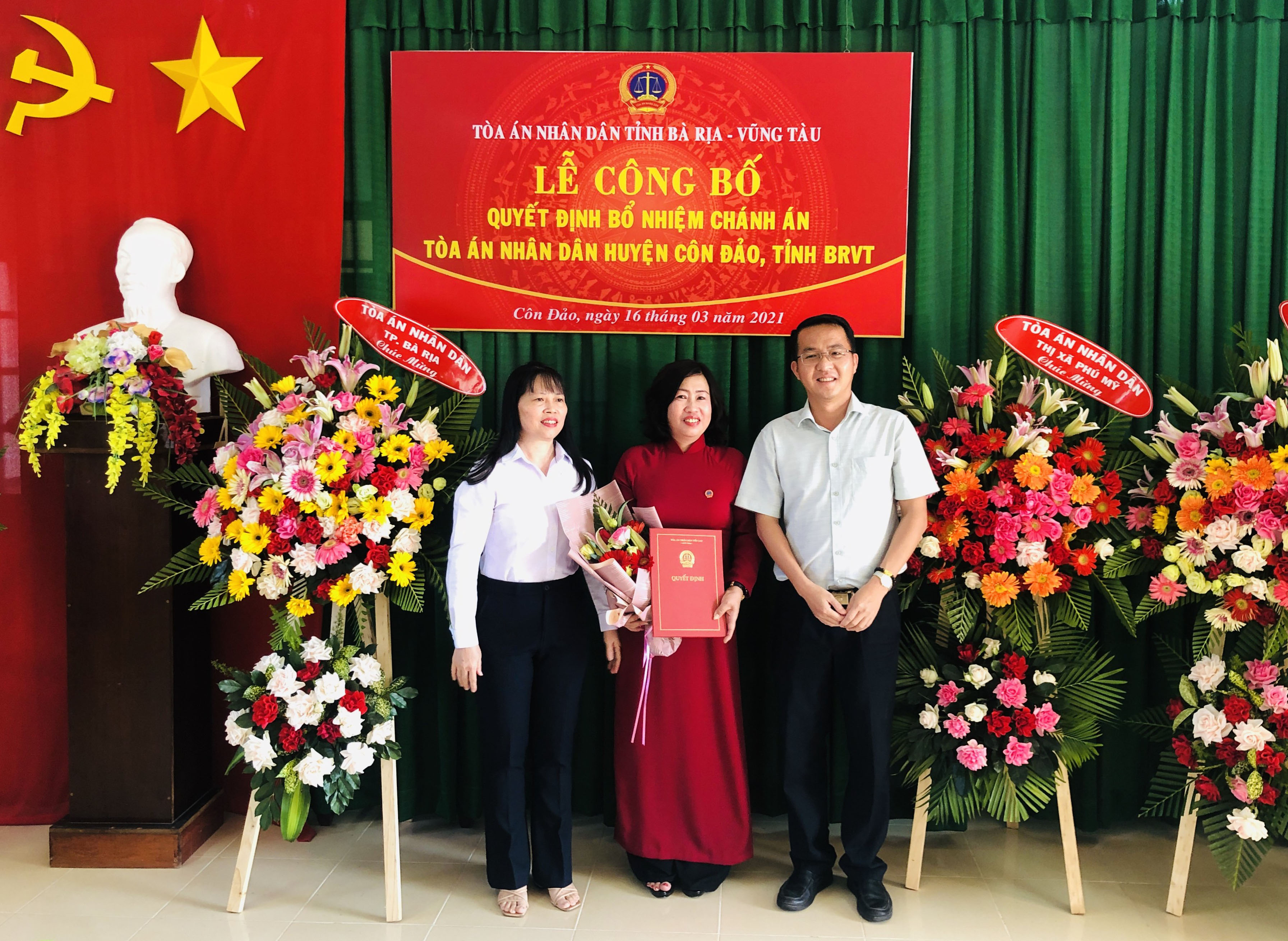 Tại buổi lễ, bà Đào Thị Huệ, Phó Chánh án TAND tỉnh đã trao Quyết định số 233/QĐ-TCCB, ngày 3/3/2021 của Chánh án TAND Tối cao về việc điều động, bổ nhiệm bà Trần Thị Mỹ Dung giữ chức vụ Chánh án TAND huyện Côn Đảo, nhiệm kỳ là 5 năm, kể từ ngày 5/3/2021.