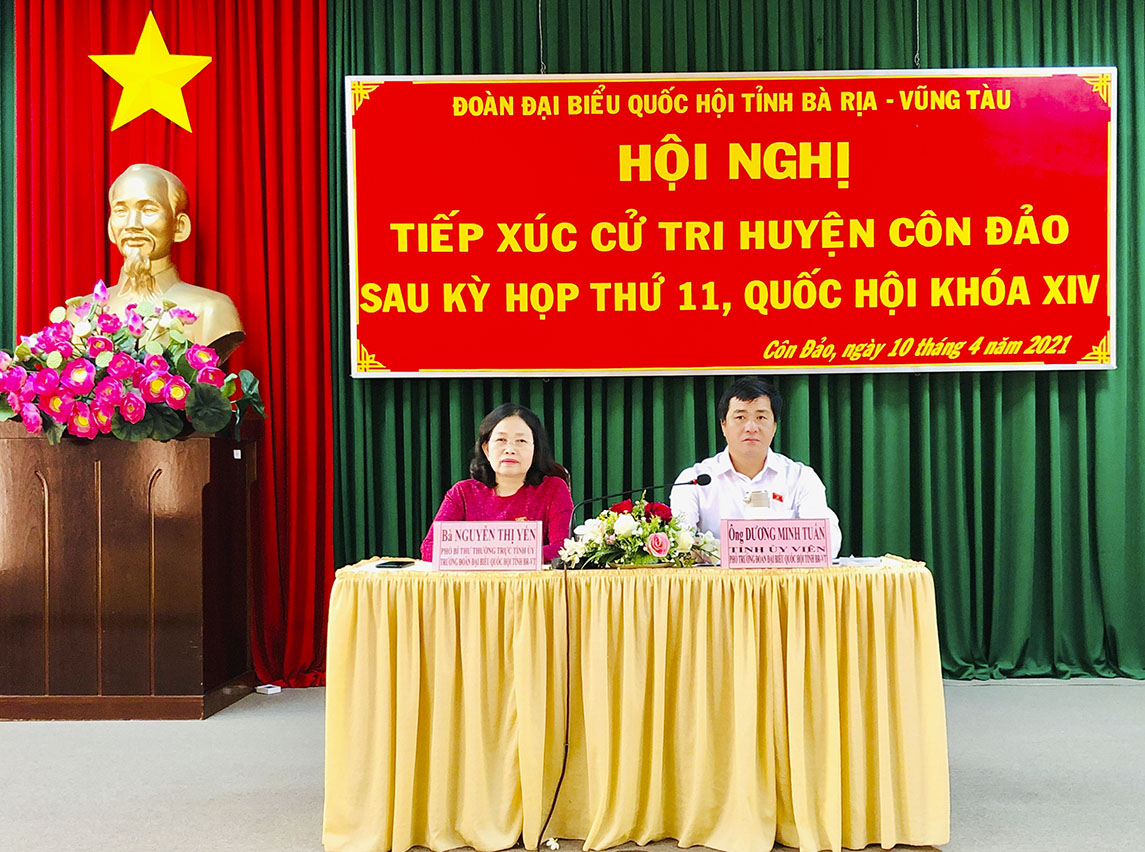 Cử tri huyện Côn Đảo đánh giá cao kết quả Kỳ họp thứ 11, Quốc hội khóa XIV và hoạt động của Đoàn ĐBQH tỉnh tại Kỳ họp này. Đồng thời, kiến nghị đến các ĐBQH một số nội dung như: xem xét không giới thiệu người ứng cử đại biểu HĐND các cấp đối với những người đang có đơn thư khiếu nại, tố cáo; xem xét quy trình xử lý, giải quyết đơn thư phản ánh, tố cáo của công dân cũng như trách nhiệm của các cơ quan, đơn vị được giao giải quyết đơn thư. Cử tri cũng phản ánh về đạo đức công vụ của một bộ phận cán bộ, công chức khi tiếp xúc với công dân.