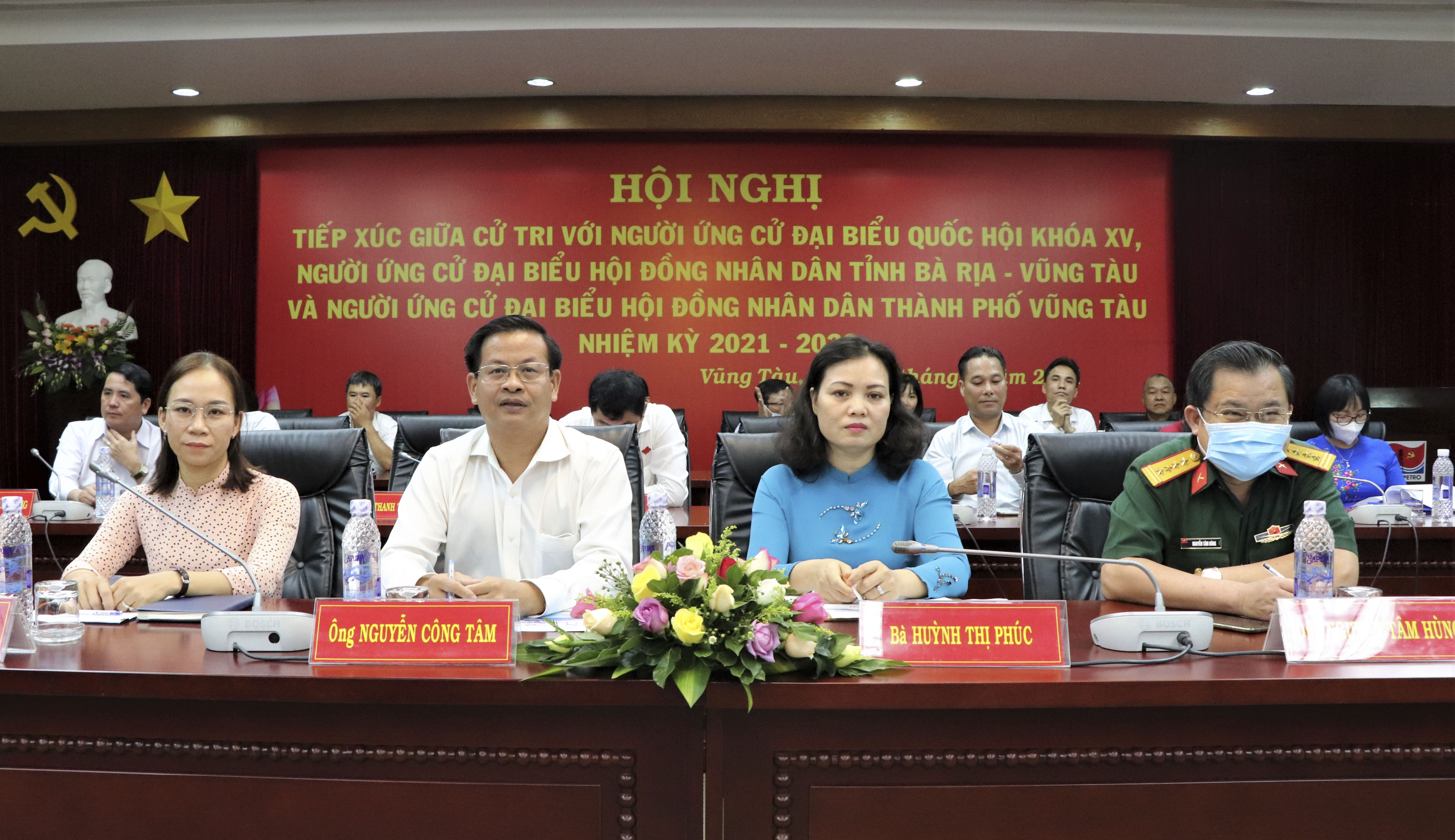 Trong đó, 4 ứng cử viên ĐBQH khóa XV (đơn vị bầu cử số 1) gồm: Đại tá Nguyễn Tâm Hùng, Chỉ huy Trưởng Bộ CHQS tỉnh; bà Huỳnh Thị Phúc, Phó Trưởng Ban Dân vận Tỉnh ủy; ông Nguyễn Công Tâm, Phó Chánh Văn phòng Tỉnh ủy; bà Phạm Thị Tuyết Xuân, bác sĩ chuyên khoa - Trung tâm Y tế huyện Đất Đỏ.