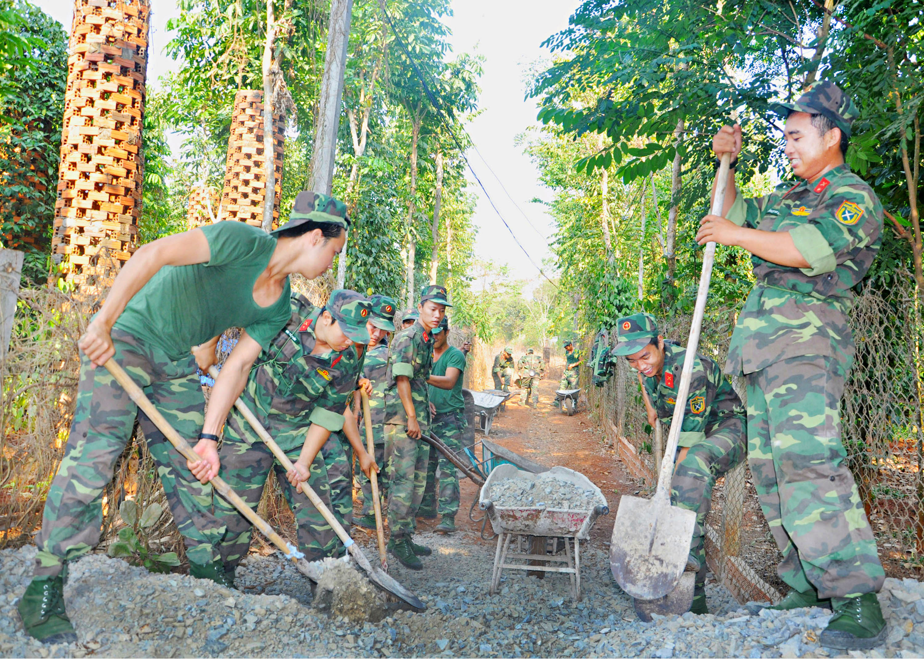 | Giai đoạn 2016-2020, LLVT tỉnh đã huy động 147.019 ngày công của cán bộ, chiến sĩ tham gia cải tạo, nâng cấp và làm mới 205km đường giao thông liên thôn, ấp; xây tặng 819 căn nhà cho hộ nghèo với tổng số tiền gần 39 tỷ đồng; nhận đỡ đầu 16 HS có hoàn cảnh đặc biệt khó khăn đến hết lớp 12 với số tiền 300-500 ngàn đồng/HS/tháng. Trong 2 đợt cao điểm phòng, chống dịch COVID-19, Bộ CHQS tỉnh đã hỗ trợ 150 tấn lương thực, thực phẩm và hơn 3,2 tỷ đồng giúp người dân ổn định cuộc sống. |