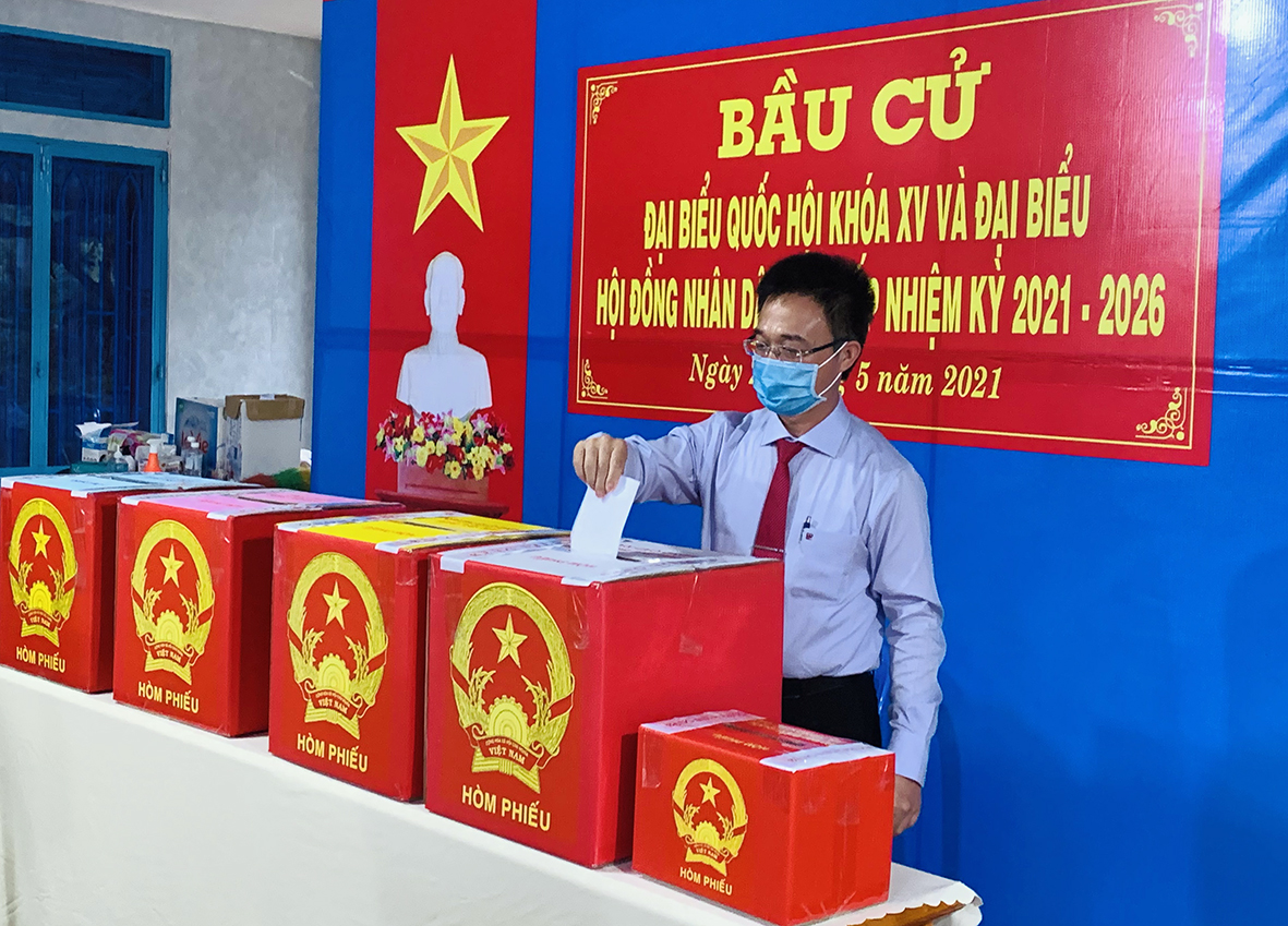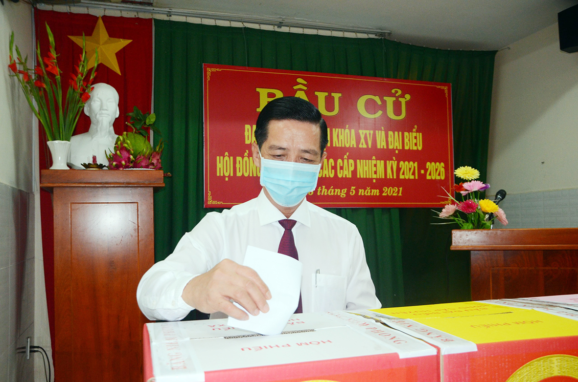 | Ông Huỳnh Văn Danh, Ủy viên Ban Thường vụ Tỉnh ủy, Trưởng Ban Dân vận Tỉnh ủy bỏ phiếu tại khu vực bầu cử số 3, KP Long Tân, TT.Long Điền, huyện Long Điền. Ảnh: ĐINH HÙNG |