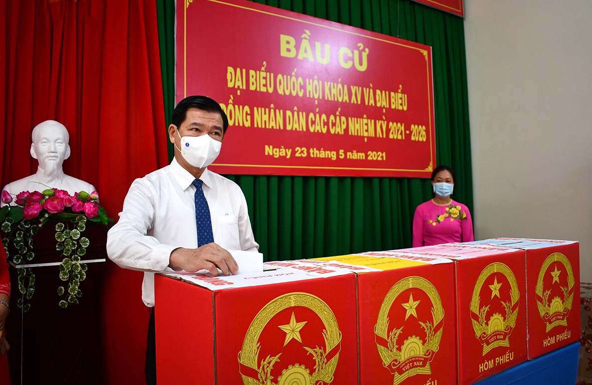 | Cử tri Đặng Minh Thông, Ủy viên Ban Thường vụ Tỉnh ủy, Bí thư Thành ủy Bà Rịa bỏ phiếu tại khu vực bỏ phiếu số 9, ấp Bắc 2, xã Hòa Long, TP.Bà Rịa Ảnh: THANH NGA |