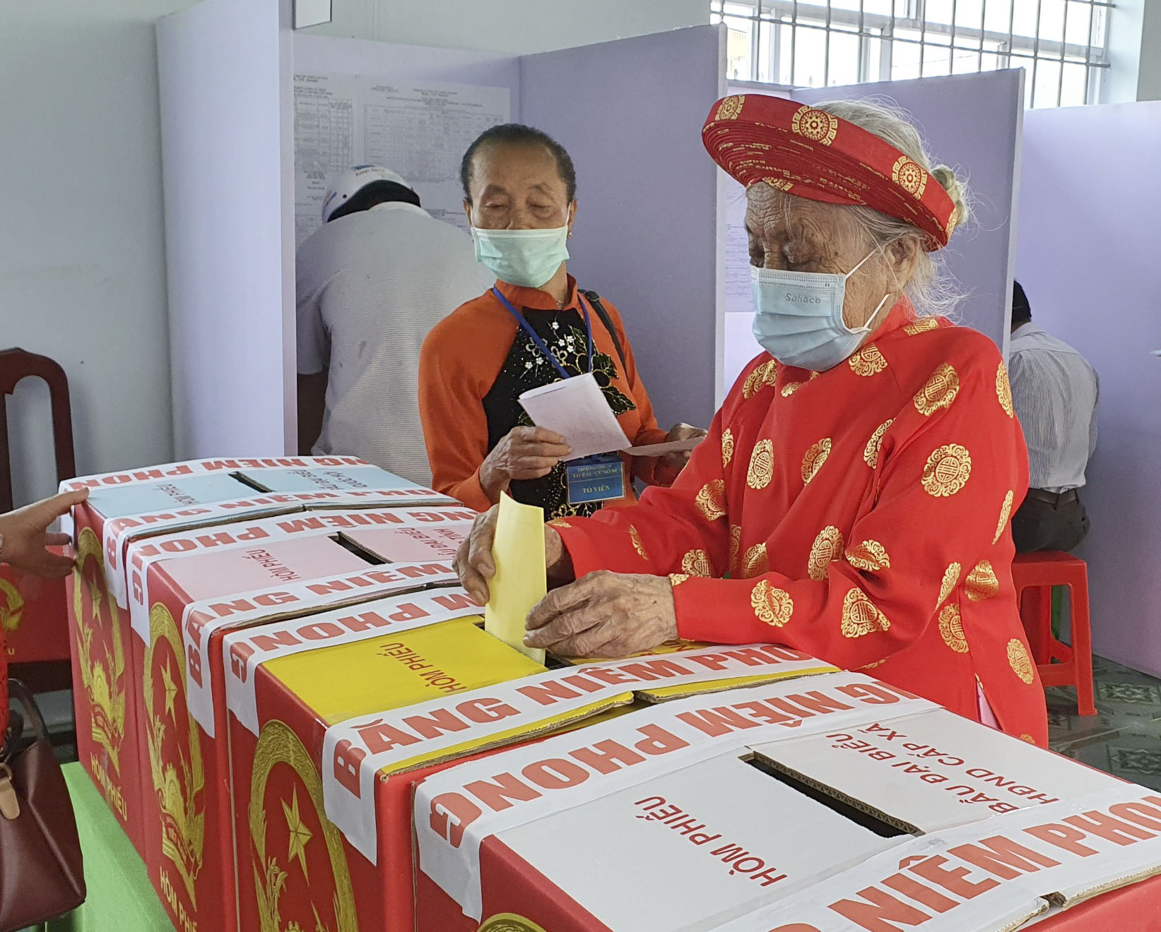 | Mẹ VNAH Võ Thị Huê (78 tuổi) là cử tri đầu tiên bỏ phiếu tại khu vực bầu cử số 8, ấp Phong Phú, xã Long Phước (TP. Bà Rịa). Ảnh: CẨM NHUNG |