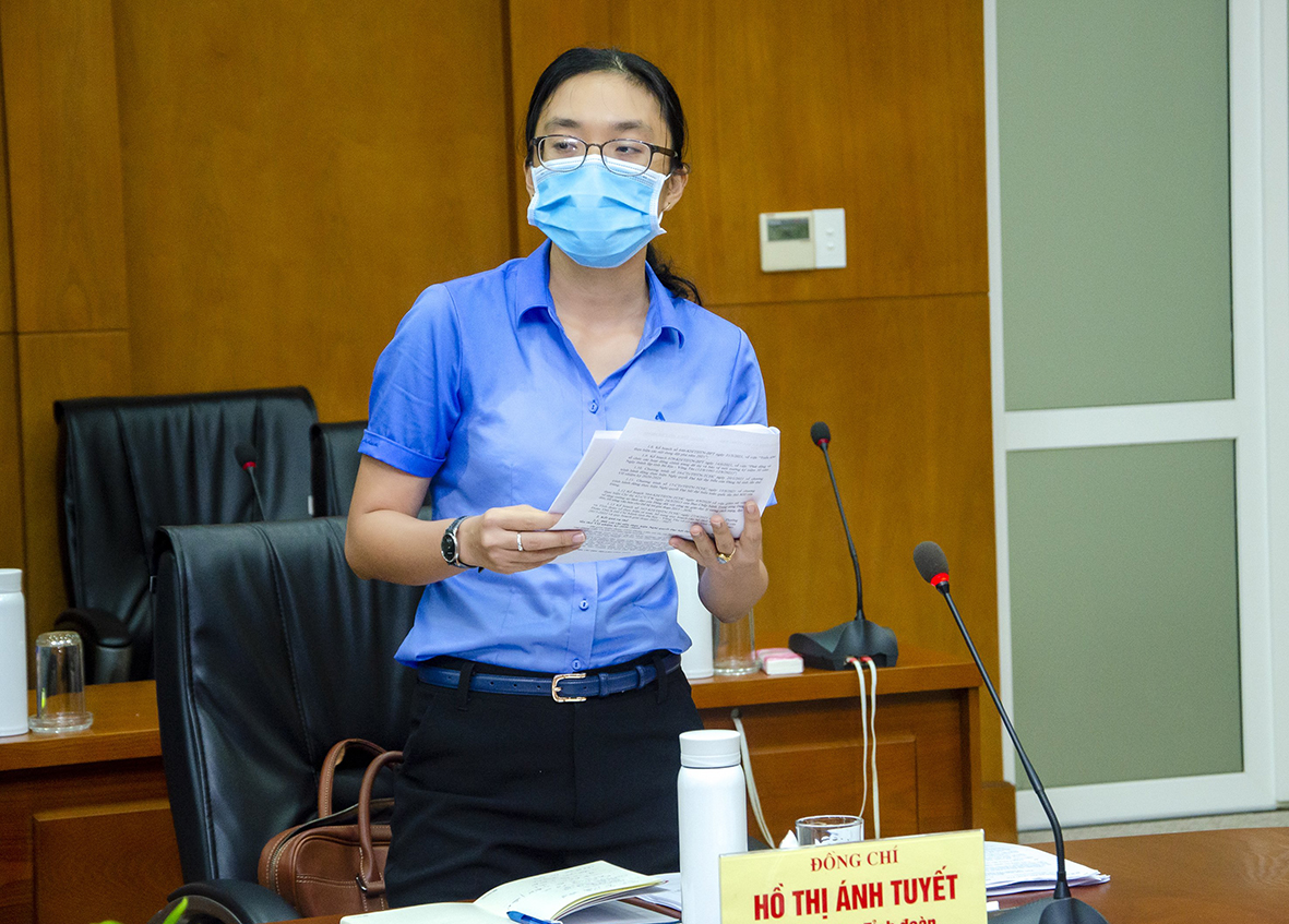 | Bí thư Tỉnh Đoàn Hồ Thị Ánh Tuyết báo cáo về tình hình thực hiện công tác 6 tháng đầu năm và nhiệm vụ 6 tháng cuối năm 2021. |