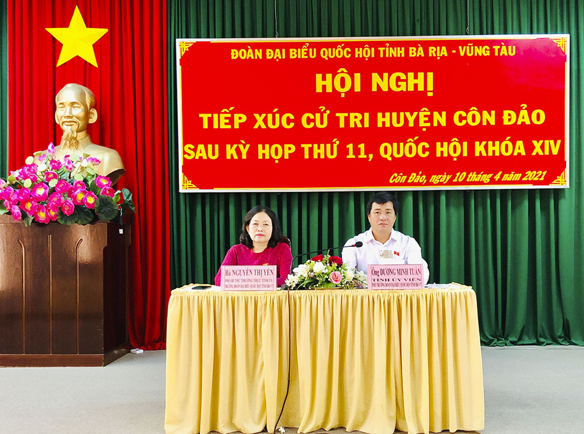 | Bà Nguyễn Thị Yến, Phó Bí thư Thường trực Tỉnh ủy, Trưởng Đoàn ĐBQH tỉnh và ông Dương Minh Tuấn, Phó Trưởng Đoàn ĐBQH tỉnh TXCT huyện Côn Đảo vào ngày 10/4/2021.Ảnh: MẠNH CƯỜNG |