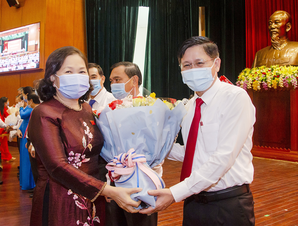 | Ông Phạm Viết Thanh, Ủy viên Trung ương Đảng, Bí thư Tỉnh ủy, Chủ tịch HĐND tỉnh; bà Nguyễn Thị Yến, Phó Bí thư Thường trực Tỉnh ủy, Trưởng Đoàn ĐBQH tỉnh; ông Mai Ngọc Thuận, Ủy viên Ban Thường vụ Tỉnh ủy, Phó Chủ tịch HĐND tỉnh tặng hoa chúc mừng các đại biểu được bầu giữ chức danh Chủ tịch, Phó Chủ tịch và Ủy viên UBND tỉnh nhiệm kỳ 2021-2026. |