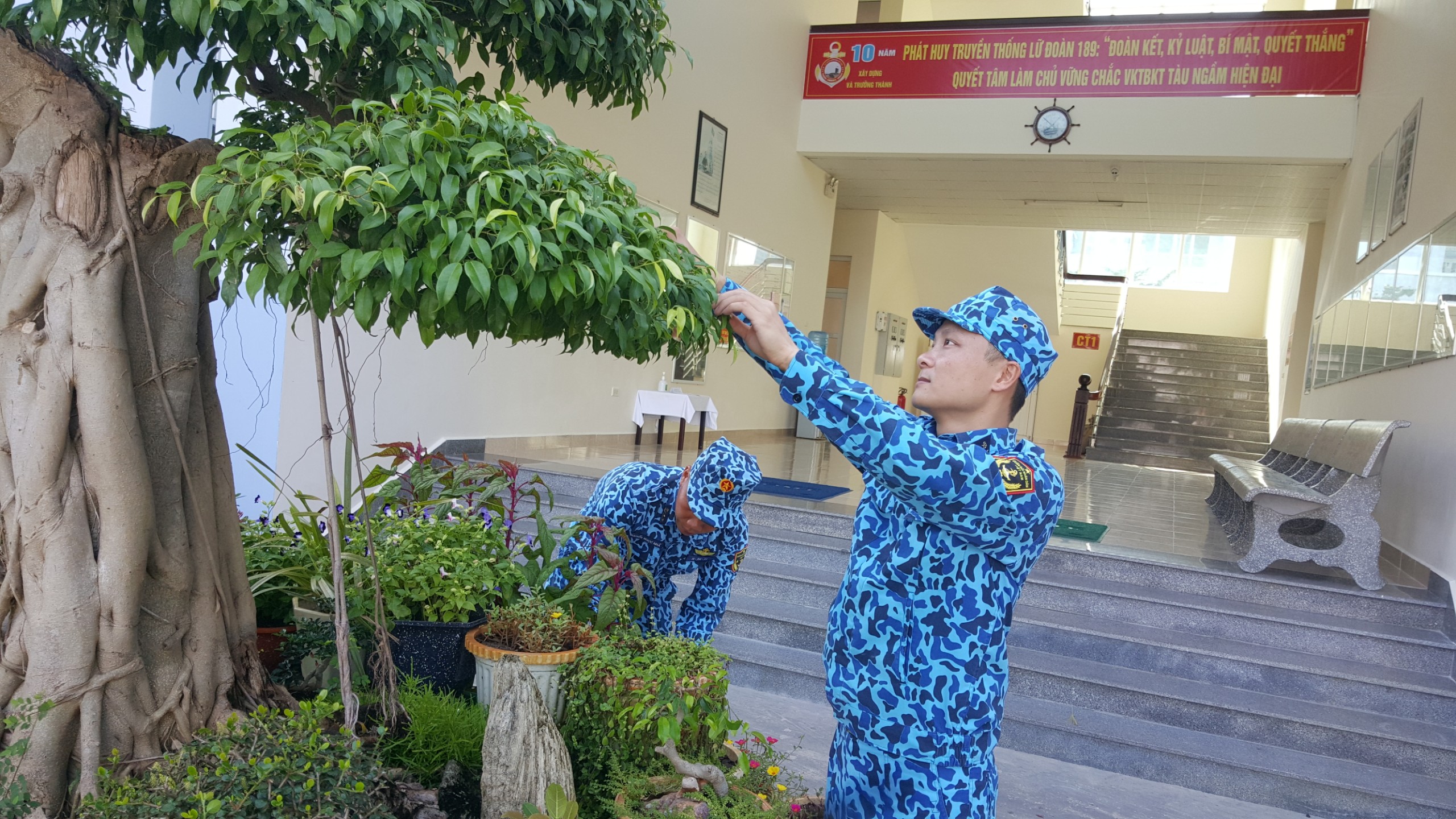 Đến thăm doanh trại Tàu 187, khách không khỏi trầm trồ thích thú bởi khuôn viên, cảnh quan khang trang, xanh, sạch, đẹp với những cây cảnh giá trị như: sanh, sung, sộp, lộc vừng, mai… được uốn nắn và tạo thế tỉ mỉ cùng nhiều cây xanh tỏa bóng mát rượi.