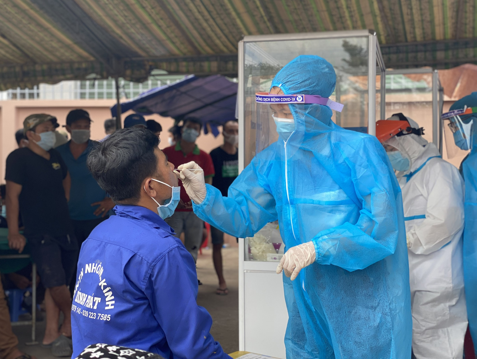 | Nhân viên y tế test nhanh cho tài xế vào BR-VT tại chốt kiểm soát phương tiện và khai báo y tế trên QL51 (phường Mỹ Xuân, TX.Phú Mỹ). |