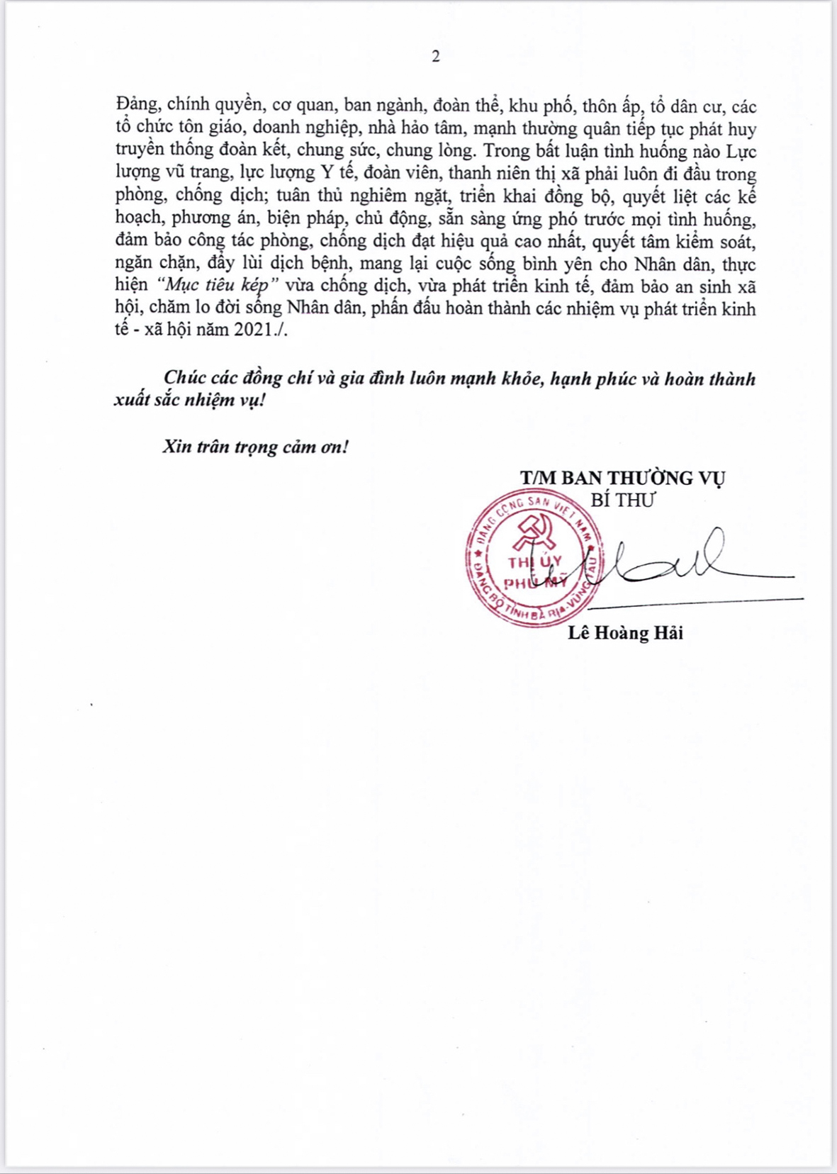 Ông Lê Hoàng Hải chia sẻ, thay vì tổ chức Đoàn lãnh đạo Thị ủy, UBND, UBMTTQ Việt Nam TX.Phú Mỹ trực tiếp đến thăm, động viên các lực lượng song dịch bệnh đang diễn biến phức tạp, để góp phần hiệu quả vào công tác phòng dịch, Ban Thường vụ Thị uỷ chuyển lời động viên qua thư mong các lực lượng vững tin hoàn thành nhiệm vụ.