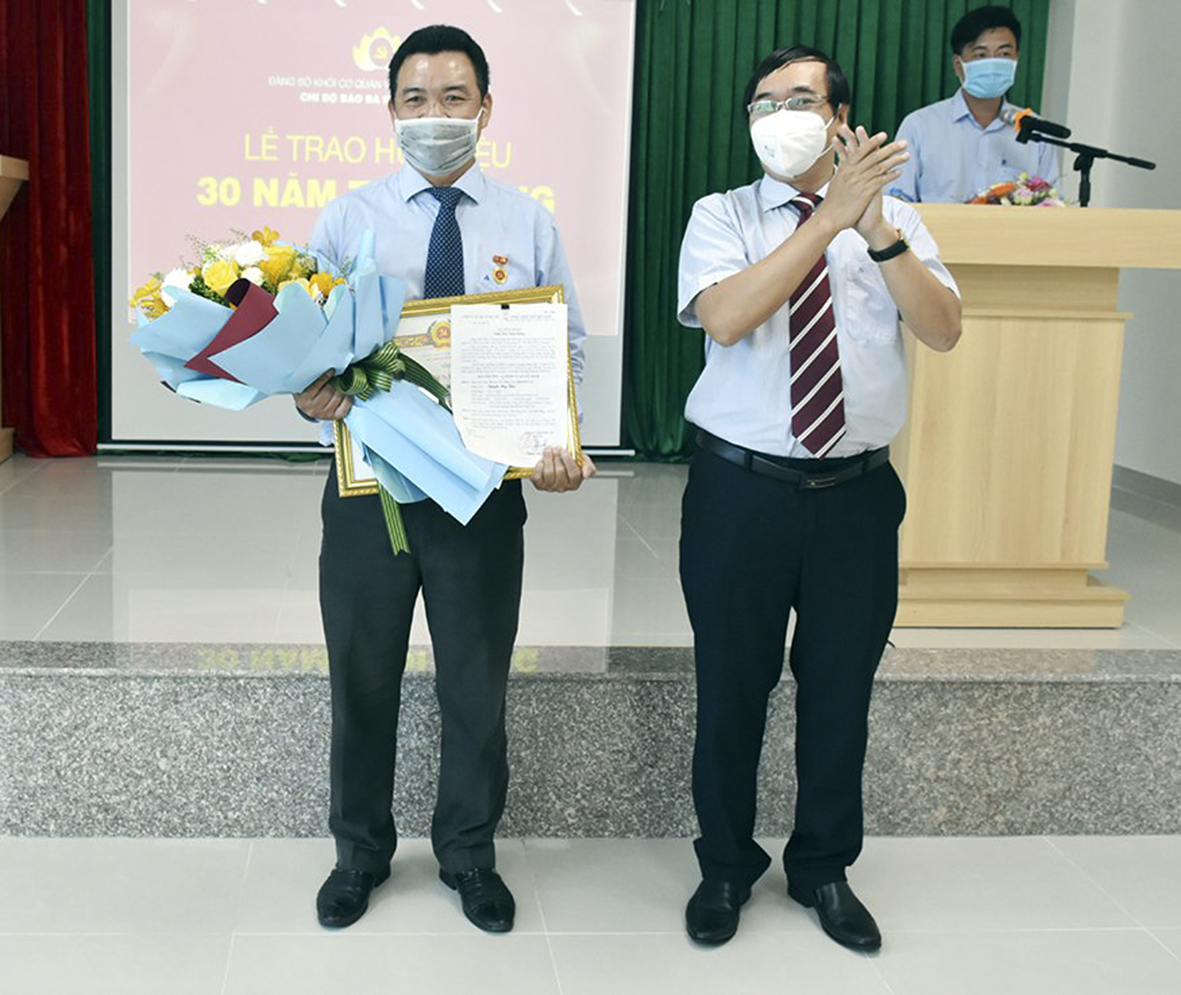 | Ông Trương Đức Nghĩa, Bí thư Chi bộ, Phó Tổng Biên tập Báo Bà Rịa - Vũng Tàu trao Huy hiệu 30 năm tuổi Đảng và tặng hoa chúc mừng đảng viên Nguyễn Huy Hoài. |