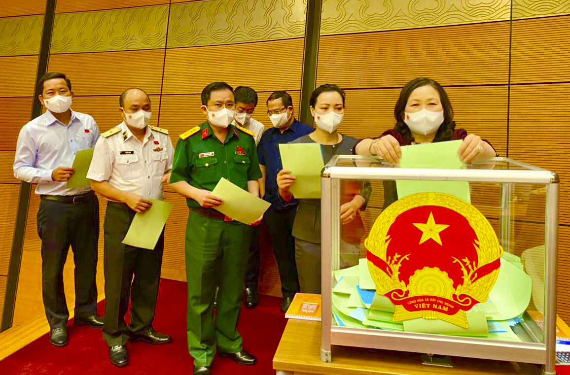 | Chủ tịch nước Nguyễn Xuân Phúc, Thủ tướng Phạm Minh Chính, Chủ tịch Quốc hội Vương Đình Huệ, Phó Chủ tịch Thường trực Quốc hội Trần Thanh Mẫn và Chủ tịch Ủy ban Trung ương MTTQ Việt Nam Đỗ Văn Chiến bỏ phiếu bầu. Ảnh: TTXVN |