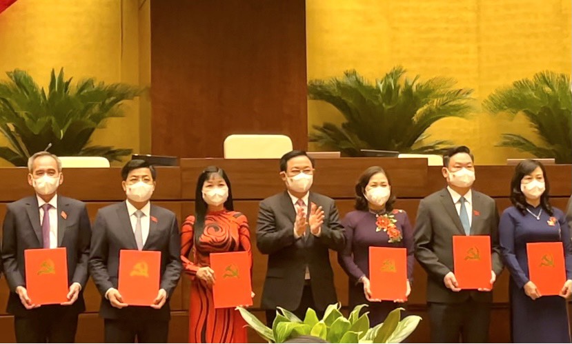 | Chủ tịch Quốc hội Vương Đình Huệ trao Nghị quyết phê chuẩn kết quả bầu Trưởng Đoàn đại biểu Quốc hội các tỉnh, thành phố. Ảnh: CHÂU VŨ |