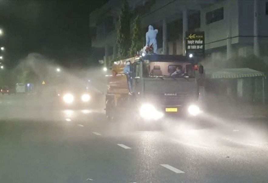 | Lực lượng chức năng phun khử khuẩn toàn bộ khu vực chợ Bà Rịa đêm 2/7. |