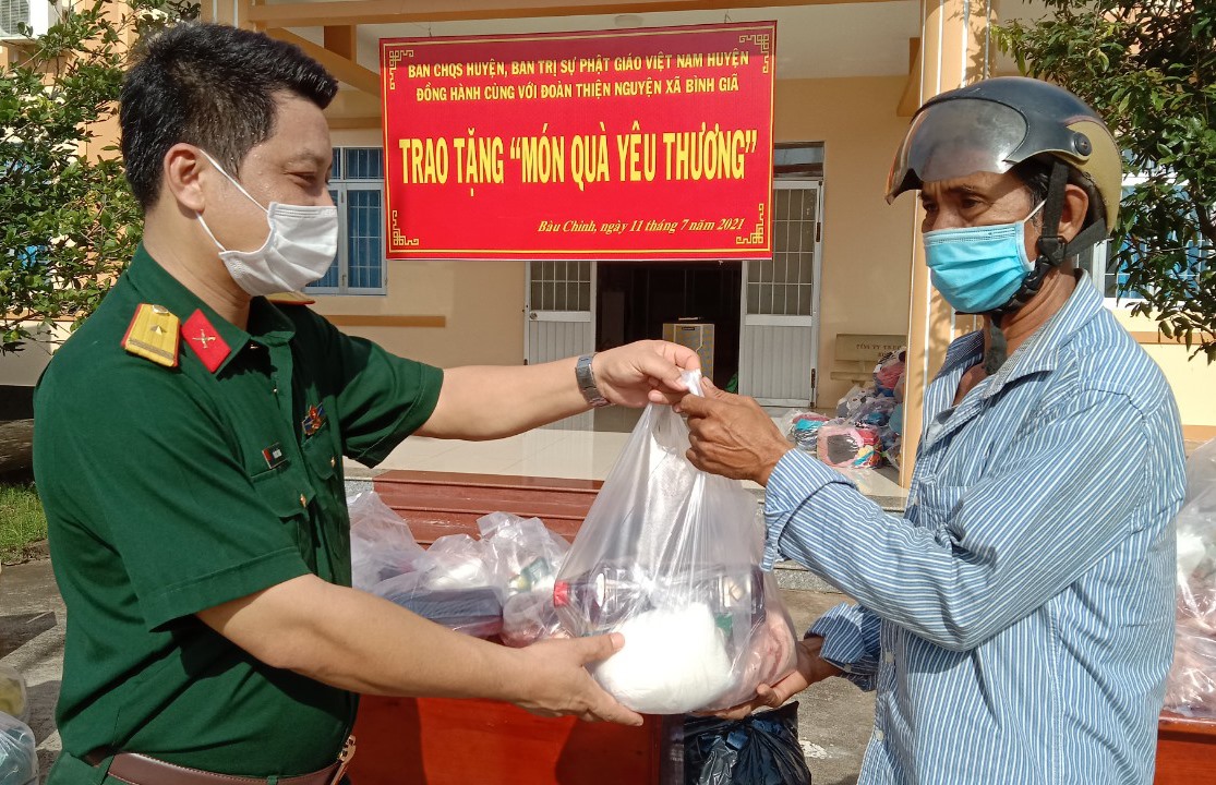 | Đại diện Ban CHQS huyện Châu Đức trao quà cho người dân xã Bàu Chinh trong chương trình “Món quà yêu thương – giúp dân vượt khó”. |
