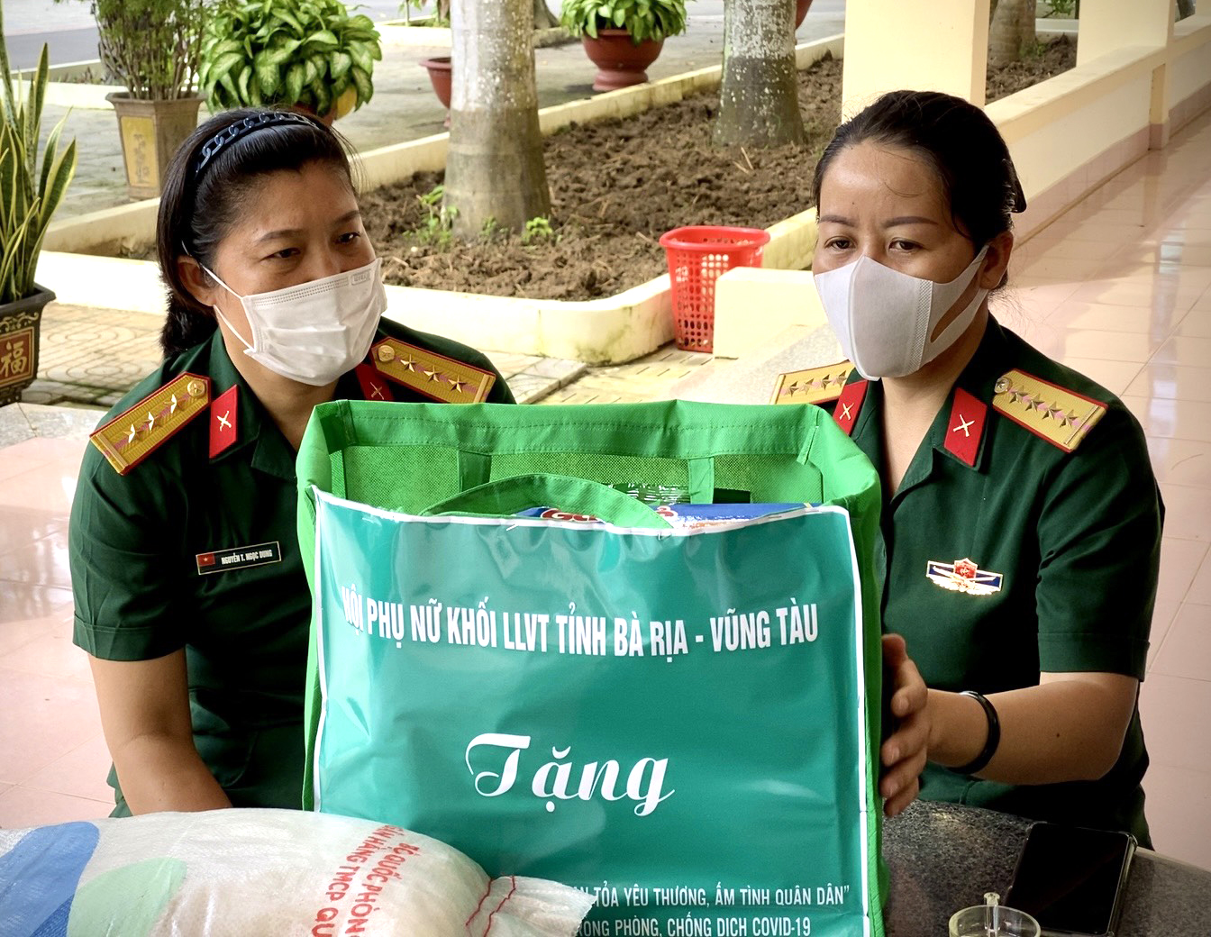 | Đại diện Hội Phụ nữ Khối LLVT tỉnh (phải) tặng quà cho Thượng úy Nguyễn Thị Ngọc Dung, nhân viên nấu ăn Ban CHQS huyện Đất Đỏ. |