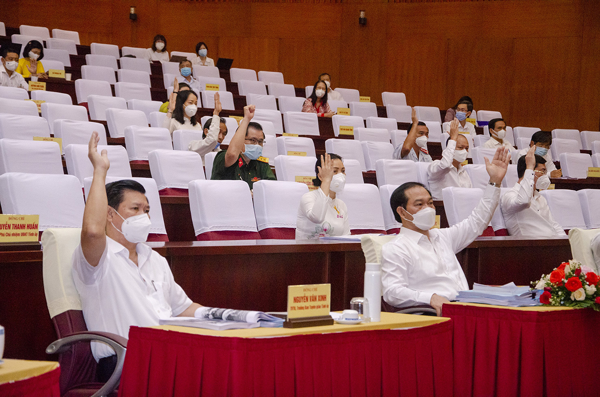 | Các đại biểu biểu quyết thông qua Nghị quyết về phương hướng, nhiệm vụ kinh tế - xã hội, quốc phòng - an ninh, xây dựng Đảng năm năm 2022. |