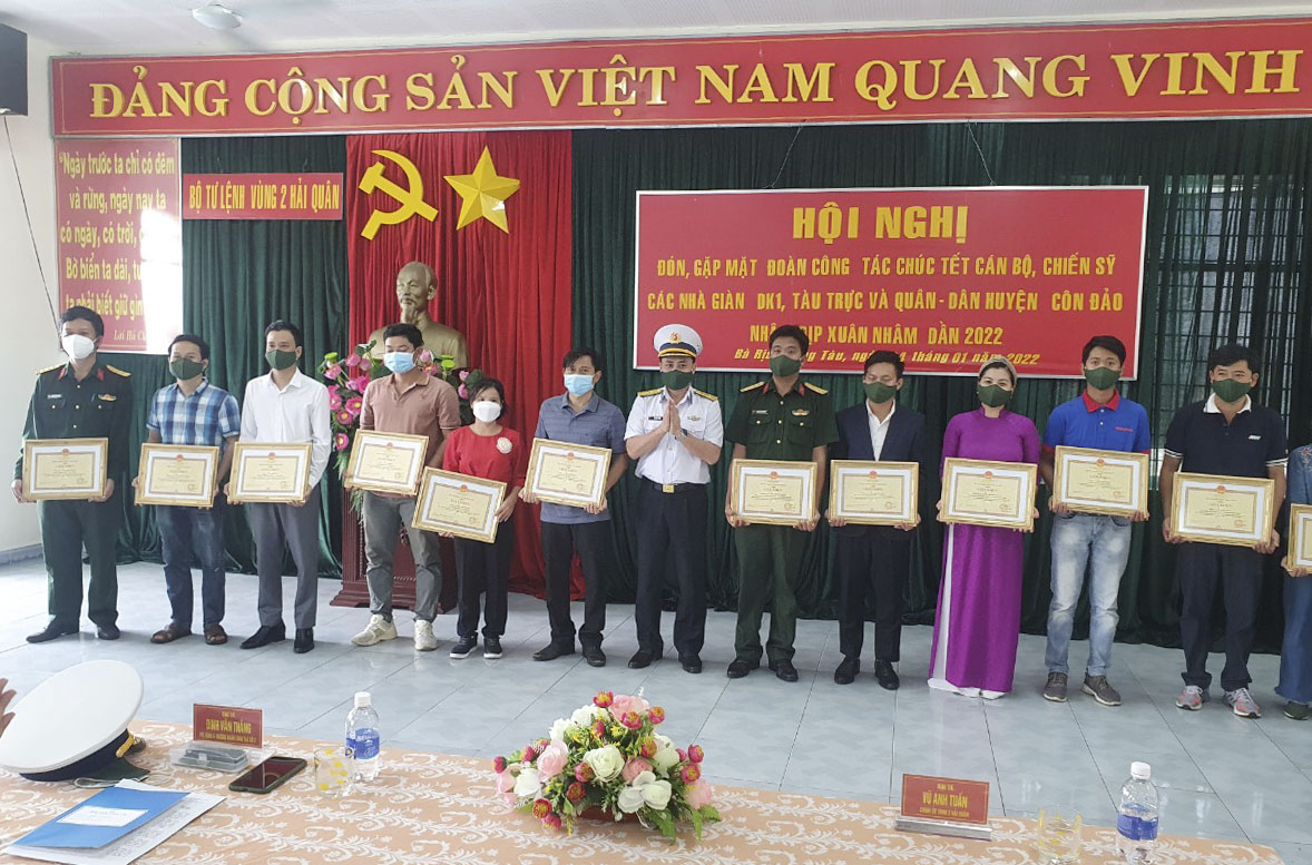 Dịp này, Vùng 2 Hải quân đã tặng Giấy khen cho 2 tập thể và 22 cá nhân có thành tích xuất sắc trong thực hiện nhiệm vụ đi thăm, chúc Tết cán bộ, chiến sĩ trên các nhà giàn DK1, tàu trực, Trạm radar 590 và các cơ quan dân chính đảng huyện Côn Đảo.