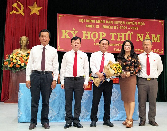| Lãnh đạo Huyện ủy, HĐND, UBND huyện Xuyên Mộc tặng hoa chúc mừng ông Nguyễn Văn Tiến (thứ 3 bên phải qua). |