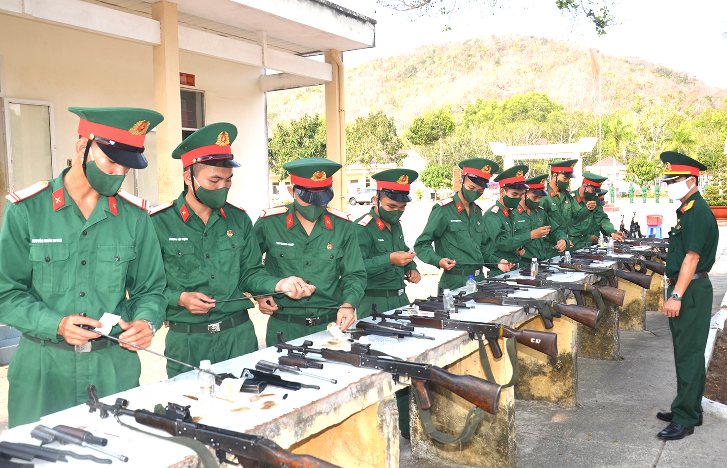 | Cán bộ, chiến sĩ Trung đoàn Minh Đạm - Bộ CHQS tỉnh thực hiện “Ngày kỹ thuật” lau chùi, bảo quản súng AK. |